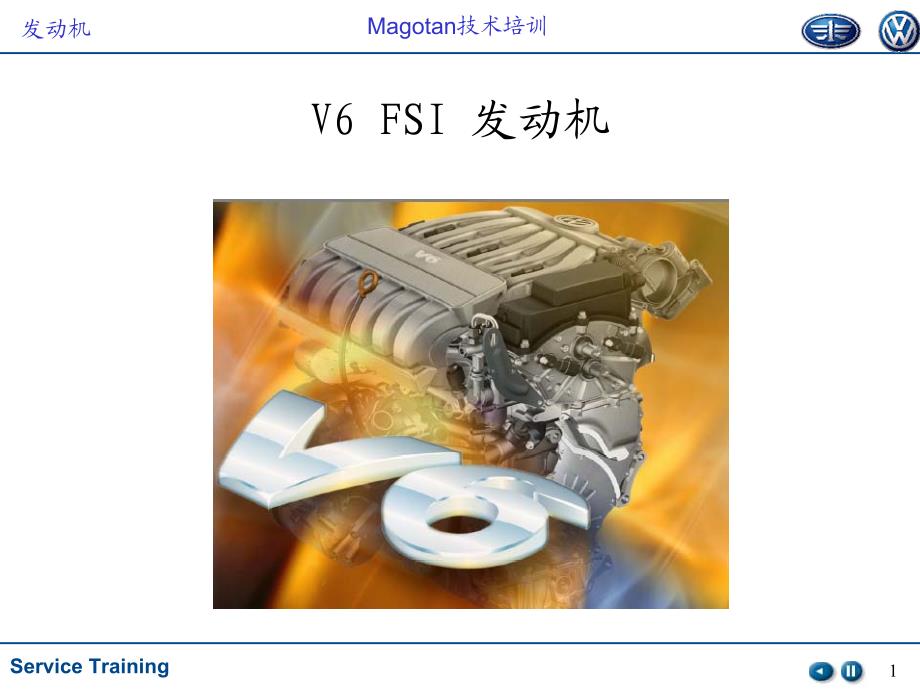 Service TrainingMagotan技术培训发动机1V6 FSI 发动机Service TrainingMagotan技术培训发动机2技术数据曲轴驱动曲轴、连杆、活塞缸盖缸盖罩盖可变进气相位内容进气歧管转换链驱动皮带驱动发动机润滑发动机冷却低压燃油系统排气系统系统概述功能图高压燃油系统Service TrainingMagotan技术培训发动机3外形尺寸保持不变FSI-汽油直喷带有滚子摇臂的四气门技术内部废气再循环塑料制整体式可变进气歧管曲轴箱由灰口铸铁制成,重量较低链条传动机构布置在变速器一侧带有高压燃油泵的驱动装置(集成式的)进、排气凸轮轴均可无级调节发动机特点Service TrainingMagotan技术培训发动机4技术数据发动机代码 AXZ 形式 6缸 VR 发动机 排量 [cm3] 3189 cm3 缸径 [mm] 86.0 mm 冲程 [mm] 90.9 mm V-角度 10.6° 每缸气门数 4 压缩比 12.0 最大功率 184 kW at 6250 rpm 最大扭矩 330 Nm at 2750 - 3750 rpm 发动机管理系统 Motronic ME 7.1.1 燃油 RON 95 尾气处理 带氧传感器的三元催化转换器 排放标准 EU4 Service TrainingMagotan技术培训发动机5发动机代码 BHK 形式 6缸 VR发动机 排量 [cm3] 3597 cm3 缸径 [mm] 89 mm 冲程 [mm] 96.4 mm V-角度 10.6° 每缸气门数 4 压缩比 12.0 最大功率 206 kW at 6200 rpm 最大扭矩 360 Nm at 2500 - 5000 rpm 发动机管理系统 Motronic ME 7.1.1 燃油 RON 95 尾气处理 带氧传感器的三元催化转换器 排放标准 EU4, 技术数据Service TrainingMagotan技术培训发动机63.2 ltr. V6 FSI engine4404003603202802402001601208040220200180160140120100806040201000 3000 5000[rpm]Power output [kW]Torque [Nm]F360_1163. 6 ltr. V6 FSI engine (Touareg)4404003603202802402001601208040220200180160140120100806040201000 3000 5000[rpm]Power output [kW]Torque [Nm]F360_115技术数据Service TrainingMagotan技术培训发动机7缸体缸体是采用片状石墨的灰口铸铁制造的Service TrainingMagotan技术培训发动机810.6°22 mm缸体V形角缸体的V形夹角为10.6°V形夹角从15°变为10.6°,这样就可在不改变发动机安装尺寸的情况下还能保证气缸璧厚度气缸偏移由于V形角减小了,所以气缸的纵轴线在下面相对于曲轴就向外移动了气缸的纵轴线相对于曲轴中央轴线的距离就称为气缸偏移与进气管喷射式发动机相比,气缸偏移从12.5mm增加到22mm。