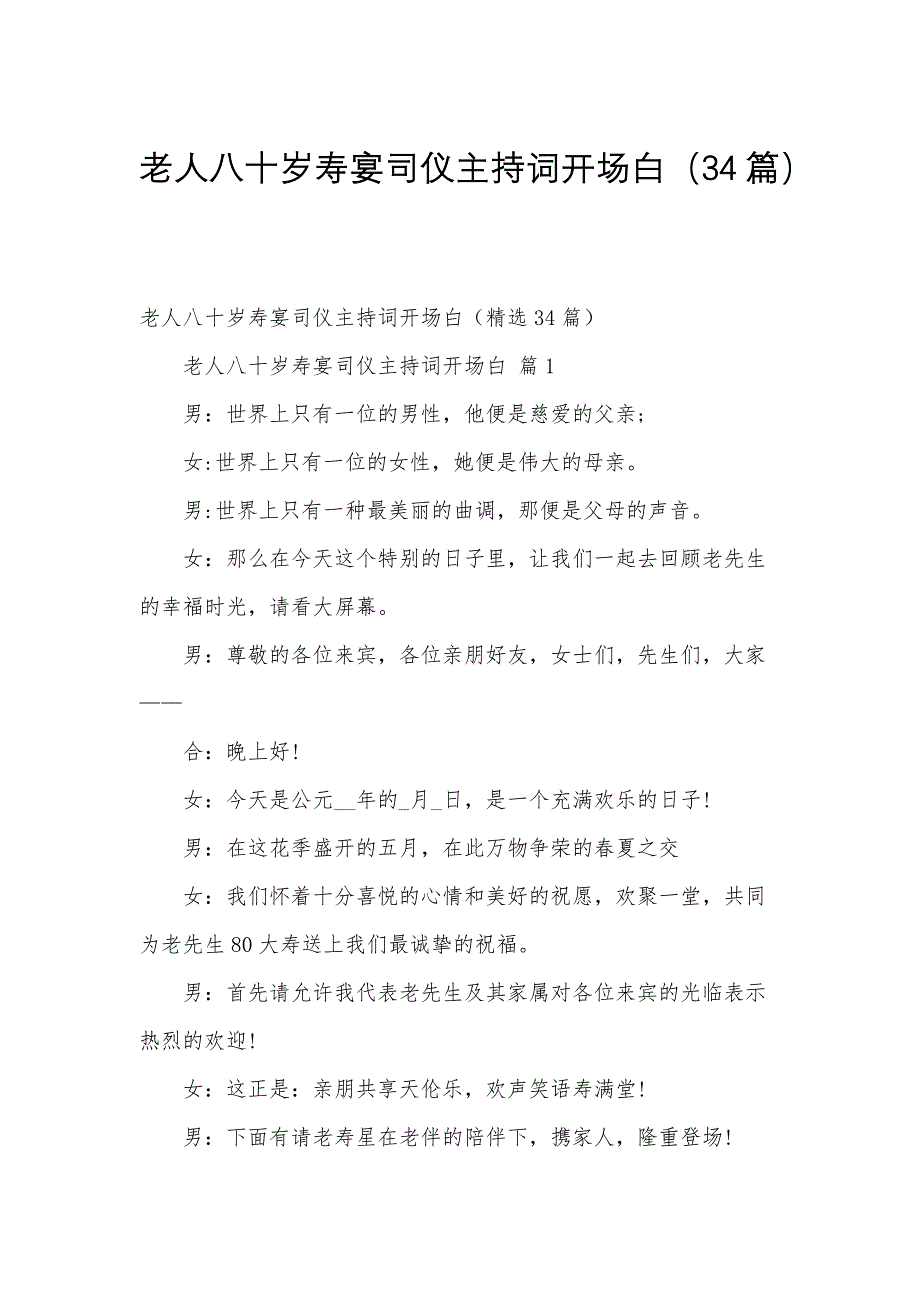 老人八十岁寿宴司仪主持词开场白(34篇)老人八十岁寿宴司仪主持词开场白(精选34篇) 老人八十岁寿宴司仪主持词开场白 篇1 男:世界上只有一位的男性,他便是慈爱的父亲; 女:世界上只有一位的女性,她便是伟大的母亲 男:世界上只有一种最美丽的曲调,那便是父母的声音 女:那么在今天这个特别的日子里,让我们一起去回顾老先生的幸福时光,请看大屏幕 男:尊敬的各位来宾,各位亲朋好友,女士们,先生们,大家—— 合:晚上好! 女:今天是公元__年的_月_日,是一个充满欢乐的日子! 男:在这花季盛开的五月,在此万物争荣的春夏之交 女:我们怀着十分喜悦的心情和美好的祝愿,欢聚一堂,共同为老先生80大寿送上我们最诚挚的祝福 男:首先请允许我代表老先生及其家属对各位来宾的光临表示热烈的欢迎! 女:这正是:亲朋共享天伦乐,欢声笑语寿满堂! 男:下面有请老寿星在老伴的陪伴下,携家人,隆重登场! 女:请今天的寿星沈老致答谢词 男:有请先生,代表子女致词 女:下面请寿星的子女奉上这充满喜庆、充满祝福、象征着团圆甜蜜、吉祥长寿的生日蛋糕 男:有请吹生日蜡烛,美好的心愿将从这一刻开始实现! 女:有请为您的八十大寿剪彩,切开这喜庆的生日蛋糕,让我们共同祝愿增福增寿增富贵 男:添光添彩添吉祥。