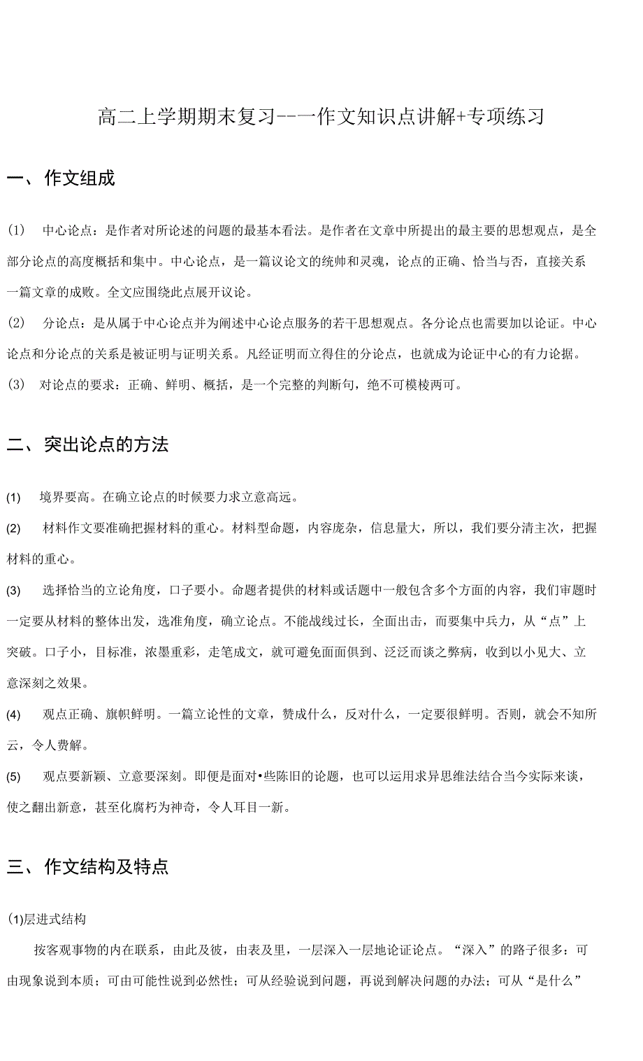 高二上学期期末复习--一作文知识点讲解+专项练习一、 作文组成(1) 中心论点:是作者对所论述的问题的最基本看法是作者在文章中所提出的最主要的思想观点,是全部分论点的高度概括和集中中心论点,是一篇议论文的统帅和灵魂,论点的正确、恰当与否,直接关系一篇文章的成败全文应围绕此点展开议论2) 分论点:是从属于中心论点并为阐述中心论点服务的若干思想观点各分论点也需要加以论证中心论点和分论点的关系是被证明与证明关系凡经证明而立得住的分论点,也就成为论证中心的有力论据3) 对论点的要求:正确、鲜明、概括,是一个完整的判断句,绝不可模棱两可二、 突出论点的方法(1) 境界要高在确立论点的时候要力求立意高远2) 材料作文要准确把握材料的重心材料型命题,内容庞杂,信息量大,所以,我们要分清主次,把握材料的重心3) 选择恰当的立论角度,口子要小命题者提供的材料或话题中一般包含多个方面的内容,我们审题时一定要从材料的整体出发,选准角度,确立论点不能战线过长,全面出击,而要集中兵力,从“点”上突破口子小,目标准,浓墨重彩,走笔成文,就可避免面面俱到、泛泛而谈之弊病,收到以小见大、立意深刻之效果4) 观点正确、旗帜鲜明。
