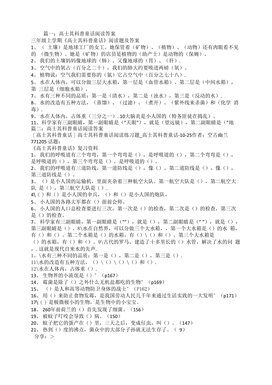 篇一:高士其科普童话阅读答案三年级上学期《高士其科普童话》阅读题及答案1、 ( 土壤)是地球工厂的女工她保管着(矿物)、(植物)、(动物)还有肉眼看不见的 (微生物)她是(矿物)的店员是植物的(助产士)是动物的(保姆)2、 我们的土壤妈妈像地球的(肺)又像地球的(胃)、(肝).3、 空气中的氧占(百分之二十),我们的肺大约要吸进两磅(氧)4、 植物说:空气我们需要你的(氮)它占空气中(百分之七十八).5、 水在人体内,可以分做三层大水箱,第一层是(血管水箱)、第二层是(中间水箱),第 三层是(细胞水箱)7、 水有三种不同的品质:第一是(清水),第二是(浊水),第三是(反动的水).8、 水的改造有五种方法,(蒸馏)、(过滤)、(煮开)、(紫外线来杀菌)和(化学 消毒).9、 水在人体内,占体重(三分之一).10大脑炎是小人国的(特务匪徒在捣乱)11、科学家有三副眼睛,第一副眼睛是("天眼”),就是(望远镜),第二副眼睛是(”地 篇二:高士其科普童话阅读答案[高士其科普童话]高士其科普童话阅读练习题_高士其科普童话-10-25作者:空古幽兰771205 话题:《高士其科普童话》复习资料1、 我们的呼吸道有三个弯弯,第一个弯弯是(),是呼吸道的(),第二个弯弯是(), 是呼吸道的(),第三个弯弯是(),是呼吸道的()。