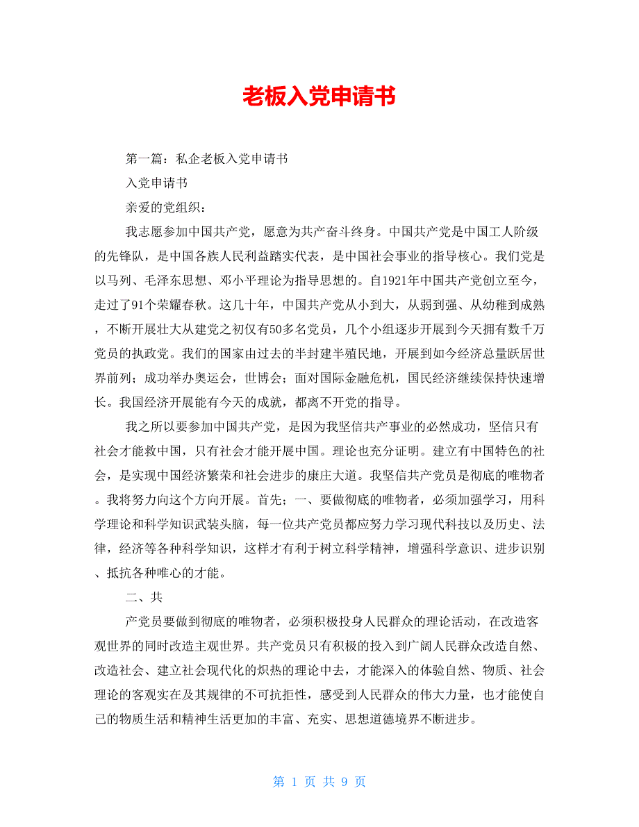 老板入党申请书第一篇:私企老板入党申请书入党申请书亲爱的党组织:我志愿参加中国共产党,愿意为共产奋斗终身中国共产党是中国工人阶级的先锋队,是中国各族人民利益踏实代表,是中国社会事业的指导核心我们党是以马列、毛泽东思想、邓小平理论为指导思想的自1921年中国共产党创立至今,走过了91个荣耀春秋这几十年,中国共产党从小到大,从弱到强、从幼稚到成熟,不断开展壮大从建党之初仅有50多名党员,几个小组逐步开展到今天拥有数千万党员的执政党我们的国家由过去的半封建半殖民地,开展到如今经济总量跃居世界前列;成功举办奥运会,世博会;面对国际金融危机,国民经济继续保持快速增长我国经济开展能有今天的成就,都离不开党的指导我之所以要参加中国共产党,是因为我坚信共产事业的必然成功,坚信只有社会才能救中国,只有社会才能开展中国理论也充分证明建立有中国特色的社会,是实现中国经济繁荣和社会进步的康庄大道我坚信共产党员是彻底的唯物者我将努力向这个方向开展首先;一、要做彻底的唯物者,必须加强学习,用科学理论和科学知识武装头脑,每一位共产党员都应努力学习现代科技以及历史、法律,经济等各种科学知识,这样才有利于树立科学精神,增强科学意识、进步识别、抵抗各种唯心的才能。