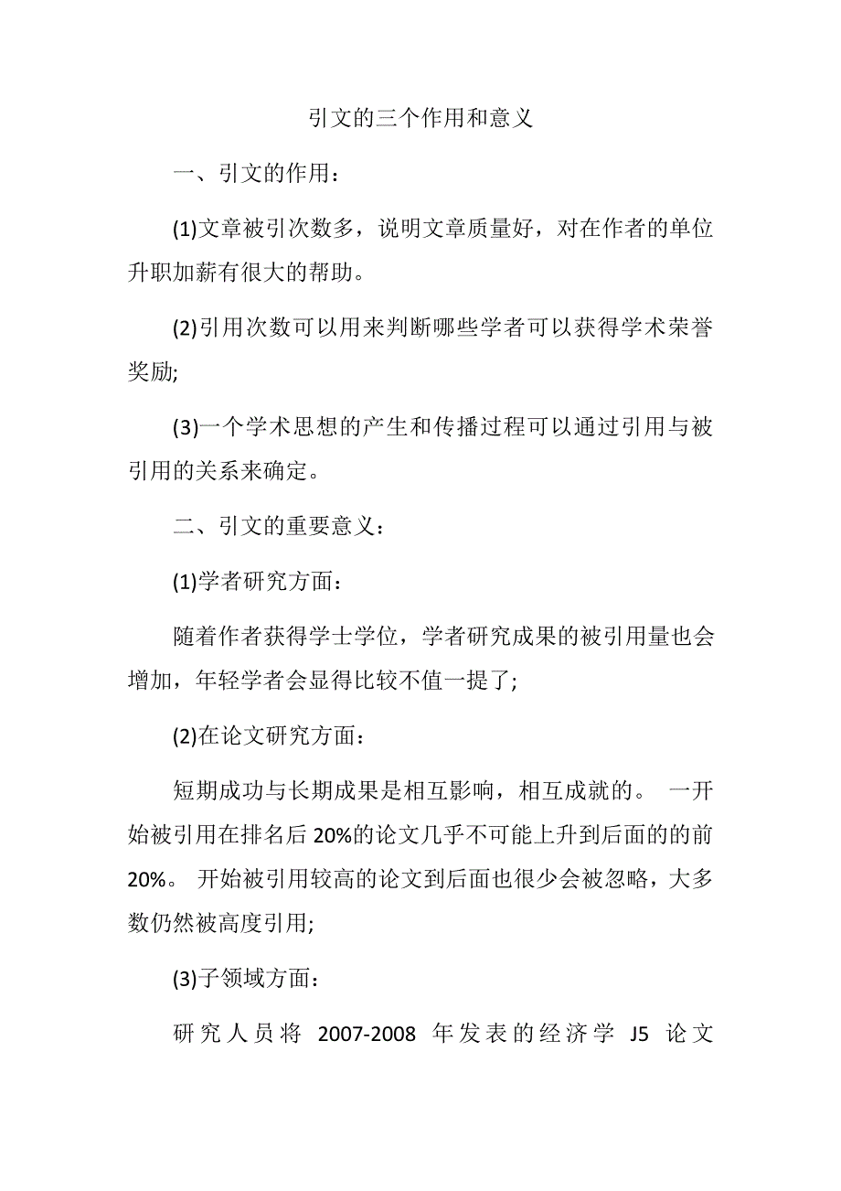 引文的三个作用和意义 一、引文的作用: (1)文章被引次数多,说明文章质量好,对在作者的单位升职加薪有很大的帮助 (2)引用次数可以用来判断哪些学者可以获得学术荣誉奖励; (3)一个学术思想的产生和传播过程可以通过引用与被引用的关系来确定 二、引文的重要意义: (1)学者研究方面: 随着作者获得学士学位,学者研究成果的被引用量也会增加,年轻学者会显得比较不值一提了; (2)在论文研究方面: 短期成功与长期成果是相互影响,相互成就的 一开始被引用在排名后 20%的论文几乎不可能上升到后面的的前20% 开始被引用较高的论文到后面也很少会被忽略,大多数仍然被高度引用; (3)子领域方面: 研究人员将 2007-2008 年发表的经济学 J5 论文(1974-1975年的J5论文不包括部分子领域)分为6个子领域 研究结果显示,论文发表七年后,六个领域的引用顺序为:借助现有数据的经验证据>实验>理论与模拟>借助自身数据的经验证据>计量经济学理论> 理论研究; (4)期刊方面: 一篇论文引文次数高,那么它所投稿的期刊也会在该领域拥有较高的声誉,所以,这些期刊虽然每一期发表的论文很少,但是很容易引起科研人员的关注和订阅,此期刊的被引量自然也会高于其他期刊。