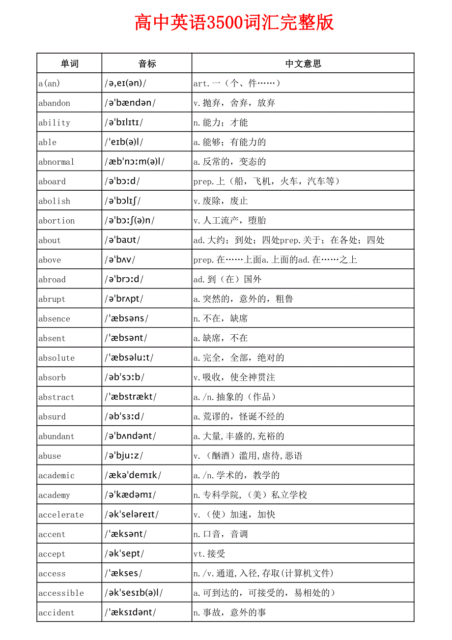 高中英语3500词汇完整版高中英语3500词汇完整版单词音标中文意思单词音标中文意思a(an)/,e(n)/art.一(个、件)abandon/bndn/v.抛弃,舍弃,放弃ability/blt/n.能力;才能able/eb()l/a.能够;有能力的abnormal/bnm()l/a.反常的,变态的aboard/bd/prep.上(船,飞机,火车,汽车等)abolish/bl/v.废除,废止abortion/b()n/v.人工流产,堕胎about/bat/ad.大约;到处;四处prep.关于;在各处;四处above/bv/prep.在上面a.上面的ad.在之上abroad/brd/ad.到(在)国外abrupt/brpt/a.突然的,意外的,粗鲁absence/bsns/n.不在,缺席absent/bsnt/a.缺席,不在absolute/bslut/a.完全,全部,绝对的absorb/bsb/v.吸收,使全神贯注abstract/bstrkt/a./n.抽象的(作品)absurd/bsd/a.荒谬的,怪诞不经的abundant/bndnt/a.大量,丰盛的,充裕的abuse/bjuz/v.(酗酒)滥用,虐待,恶语academic/kdemk/a./n.学术的,教学的academy/kdm/n.专科学院,(美)私立学校accelerate/kselret/v.(使)加速,加快accent/ksnt/n.口音,音调accept/ksept/vt.接受access/kses/n./v.通道,入径,存取(计算机文件)accessible/ksesb()l/a.可到达的,可接受的,易相处的)accident/ksdnt/n.事故,意外的事accommodation/kmde()n/n.住宿,膳宿accompany/kmpn/v.陪同,陪伴,与同时发生accomplish/kmpl/v.完成accordingto/kdt/ad.按照,根据account/kant/n.账目;描述accountant/kant()nt/n.会计,会计师accumulate/kjumjlet/v.积累,积聚accuracy/kjrs/n.准确,精确accuse/kjuz/v.正确无误的,精确的accustomed/kstmd/a.习惯于,惯常的ache/ek/vi.&n.痛,疼痛achieve/tiv/vt.达到,取得achievement/tivmnt/n.成就,成绩,功绩acid/sd/a.酸的acknowledge/knld/v.承认acquaintance/kwentns/n.熟人,(与某人)认识acquire/kwa(r)/v.获得,得到acquisition/kwz()n/n.获得,得到acre/ek(r)/n.英亩across/krs/prep.横过,穿过act/kt/n.法令,条例v.(戏)表演,扮演(角色),演出(戏);行动,做事action/k()n/n.行动active/ktv/a.积极的,主动的activity/ktvt/n.活动actor/kt(r)/n.男演员actress/ktrs/n.女演员actual/ktl/a.实际的;现实的acute/kjut/a.十分严重的,(病)急性的ad/d/(缩)“”advertisementn.广告adapt/dpt/v.使适应,适合,改编adaptation/dpte()n/n.适应,改编本add/d/vt.添加,增加addicted/dktd/a.上瘾,成瘾,入迷addition/d()n/n.增加;(算数用语)加address/dres/n.地址adequate/dkwt/a.合适的,合乎需要的adjust/dst/v.调整,调节,适应,习惯adjustment/dstmnt/n.调整,适应administration/dmnstre()n/n.管理,行政部门admirable/dmrb()l/a.值得赞赏的,可钦佩的admire/dma(r)/v.钦佩;羡慕admission/dm()n/n.准入,接纳admit/dmt/vt.承认,准许(入场,入学,入会)adolescence/dlesns/n.青春,青春期adolescent/dlesnt/n.青少年adopt/dpt/v.收养,领养adore/d(r)/v.(不用于进行时)热爱,爱慕某人adult/dlt/n.成年人advance/dvns;(US)dvns/v.推进,促进;前进advantage/dvntd/n.优点;好处adventure/dvent(r)/n.冒险;奇遇advertise/dvtaz/vt.为做广告advertisement/dvtsmnt/n.广告advice/dvas/n.忠告,劝告,建议advise/dvaz/vt.忠告,劝告,建议advocate/dvkt/v.拥护,支持,提倡aeroplane/er,plen/n.(英)飞机affair/fe(r)/n.事,事情affect/fekt/vt.影响affection/fek()n/n.喜爱,钟爱afford/fd/vt.负担得起(的费用);抽得出(时间);提供afraid/fred/a.害怕的;担心Africa/frk/*n.非洲African/frkn/a.非洲的,非洲人的n.非洲人after/ft/ad.在后;后来prep.在之后;在后面conj.在以后afternoon/ftnun/n.下午,午后afterward(s)/ftwd(z)/ad.后来again/en/ad.再一次;再,又against/enst/prep.对着,反对age/ed/n.年龄;时代agency/edns/n.代理机构agenda/dend/n.(会议)议程表,议事日程agent/ednt/n.代理人,经济人aggression/re()n/n.侵略aggressive/resv/a.侵略的;咄咄逼人ago/ad.以前agree/ri/v.同意;应允agreement/rimnt/n.同意,一致;协定,协议agricultural/rkltr()l/a.农业的agriculture/rklt(r)/n.农业,农学ahead/hed/ad.在前,向前aid/ed/n.援助;救护;辅助器具AIDS/edz/n.艾滋病aim/em/n.目的;目标v.计划,打算;瞄准;针对air/e(r)/n.空气;大气aircraft/ekrft/n.飞机(单复数同)airmail/emel/n.航空邮件airplane/eplen/n.(美)飞机airport/ept/n.航空站,飞机场airspace/espes/n.领空,(某国的)空域alarm/lm/n.警报album/lbm/n.相册,影集,集邮簿alcohol/lkhl/n.含酒精饮料,酒alcoholic/lkhlk/a./n.含酒精的,酒鬼algebra/ldbr/n.代数alike/lak/ad.很相似地,同样地alive/lav/a.活着的,存在的all/l/ad.全部地a.全(部);所有的;总;整pron.全部;全体人员allergic/ldk/a.过敏的,厌恶alley/l/n.小巷,胡同allocate/lket/v.拨给,划归,分配给allow/la/vt.允许,准许allowance/lans/n.津贴,补助almost/lmst/ad.几乎,差不多alone/ln/a.单独的,孤独的along/l;(US)l/ad.向前;和一起;一同prep.沿着;顺着alongside/lsad/ad.在旁边,与同时aloud/lad/ad.大声地alphabet/lfbet/n.字母表,字母already/lred/ad.已经also/ls/ad.也alternative/ltntv/a.可供替代,非传统的although/l/conj.虽然,尽管altitude/lttjud;(US)lttud/n.海拔高度altogether/lte(r)/ad.总共aluminium/ljmnm/n.(化)铝always/lwez/ad.总是;一直;永远am/m/v.be的人称形式之一.m./n.午前,上午A.M./n.午前,上午.m./A.M./n.午前,上午amateur/mt(r)/a.业余爱好的amaze/mez/v.惊奇,惊叹;震惊amazing/mez/a.惊奇,惊叹的;震惊的ambassador/mbsd(r)/n.大使ambassadress/mbsd(r)/n.大使ambiguous/mbjs/a.模棱两可的ambition/mb()n/n.目标,野心,雄心,抱负ambulance/mbjlns/n.救护车America/merk/*n.美国;美洲American/merkn/a.美国的;美国人的n.美国人among/m/prep.在中间;在(三个以上)之间amount/mant/n./v.金额,数量,总计ample/mp()l/a.足够的,丰裕的amuse/mjuz/vt.(使人)快乐,逗乐amusement/mjuzmnt/n.娱乐analyze/nlaz/v.分析analysis/nlss/n.分析,分析结果ancestor/nsst(r)/n.祖宗;祖先Anchor/k/n.锚,抛锚ancient/ennt/a.古代的,古老的and/nd,nd/conj.和;又;而anecdote/nkdt/n.逸事,趣闻anger/(r)/n.怒,愤怒angle/()l/n.角度angry/nr/a.生气的,愤怒的animal/nm()l/n.动物ankle/k()l/n.踝,踝关节anniversary/nvsr/n.