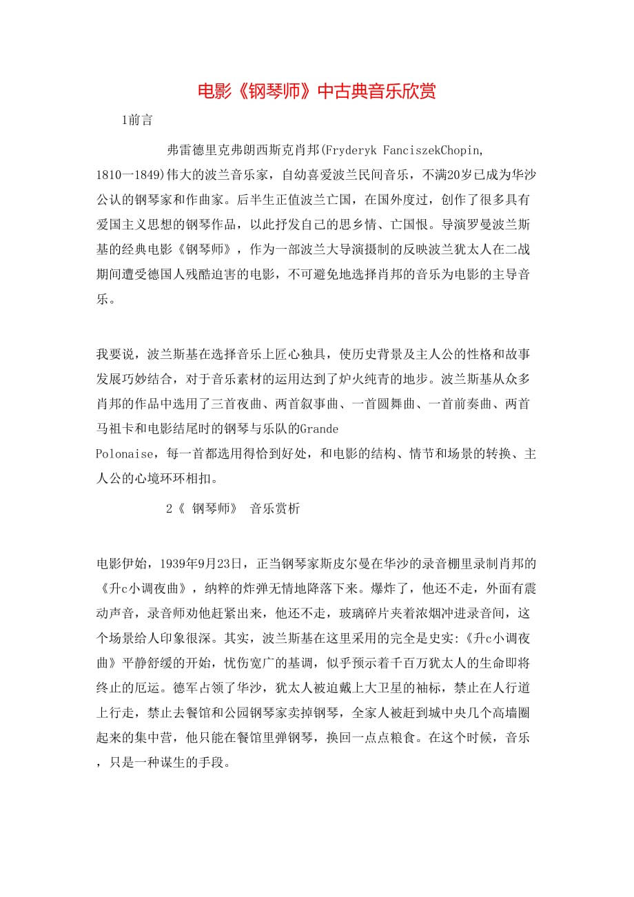 电影《钢琴师》中古典音乐欣赏1前言 弗雷德里克弗朗西斯克肖邦(Fryderyk FanciszekChopin, 1810一1849)伟大的波兰音乐家,自幼喜爱波兰民间音乐,不满20岁已成为华沙公认的钢琴家和作曲家后半生正值波兰亡国,在国外度过,创作了很多具有爱国主义思想的钢琴作品,以此抒发自己的思乡情、亡国恨导演罗曼波兰斯基的经典电影《钢琴师》,作为一部波兰大导演摄制的反映波兰犹太人在二战期间遭受德国人残酷迫害的电影,不可避免地选择肖邦的音乐为电影的主导音乐 我要说,波兰斯基在选择音乐上匠心独具,使历史背景及主人公的性格和故事发展巧妙结合,对于音乐素材的运用达到了炉火纯青的地步波兰斯基从众多肖邦的作品中选用了三首夜曲、两首叙事曲、一首圆舞曲、一首前奏曲、两首马祖卡和电影结尾时的钢琴与乐队的Grande Polonaise,每一首都选用得恰到好处,和电影的结构、情节和场景的转换、主人公的心境环环相扣 2《 钢琴师》 音乐赏析 电影伊始,1939年9月23日,正当钢琴家斯皮尔曼在华沙的录音棚里录制肖邦的《升c小调夜曲》,纳粹的炸弹无情地降落下来。