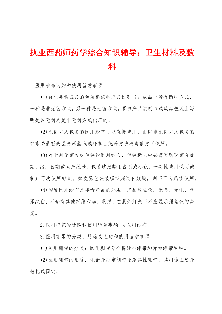 执业西药师药学综合知识:卫生材料及敷料1.医用纱布选购和使用留意事项 (1)首先要看成品的包装标识和产品说明书:成品一般有两种方式,一种是非无菌方式,另一种是无菌方式要求产品说明书或成品包装上写明是以无菌还是非无菌方式出厂的 (2)无菌方式包装的医用纱布可以直接使用,而以非无菌方式包装的纱布必需经高温高压蒸汽或环氧乙烷等方法消毒前方可使用 (3)对于用无菌方式包装的医用纱布,包装标志中必需写明灭菌有效期、出厂日期或生产批号、包装破损禁用说明或标识、一次性使用说明或制止再次使用标识如发觉包装破损或超过有效期,则不再选购或使用 (4)购置医用纱布是要看产品的外观产品应松软,无臭、无味,色泽纯白,不含有其他纤维和加工物质,在紫外灯光下不应显示强蓝色的荧光 2.医用棉花的选购和使用留意事项 同医用纱布 3.医用绷带的分类、用途及选购和使用留意事项 (1)医用绷带的分类:医用绷带分全棉纱布绷带和弹性绷带两种 (2)医用绷带的用途:无论是纱布绷带还是弹性绷带,其用途主要是包扎或固定。