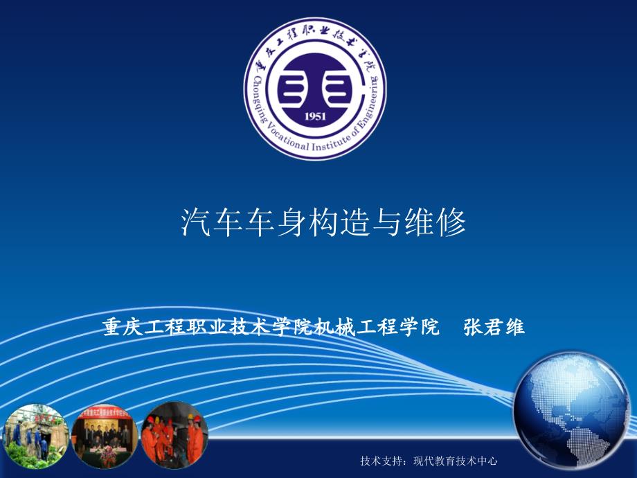 技术支持:现代教育技术中心汽车车身构造与维修重庆工程职业技术学院机械工程学院重庆工程职业技术学院机械工程学院 张君维张君维技术支持:现代教育技术中心主要内容主要内容:★汽车车身概述★汽车车身常用材料 ★汽车车身损坏分析、整形变形的测量与矫正 ★焊接工艺 ★汽车车身钣金修复基本知识、基本工艺★汽车涂装工艺基础、涂装施工★汽车车身涂料的调配与使用★汽车车身钣金及附件修复技术支持:现代教育技术中心主要内容: 第四章 汽车车身整体变形的测量与矫正 知识目标 ●掌握车身测量的基准; ●掌握车身数据图的识读方法; ●掌握车身测量方法及测量工具的使用; ●掌握车身的固定方式; ●掌握车身变形矫正的原理、方法及矫正工艺; ●掌握车身前部、后部、侧部损坏的矫正方法 技能目标 ●了解各种测量工具和测量仪器; ●了解车身前部、后部、侧部损坏的拉伸矫正方法 技术支持:现代教育技术中心主要内容:第四章 汽车车身整体变形的测量与年矫正 车身局部损伤的修复主要依赖操作技能,而车身整体变形的诊断与修复则需要更多的经验并借助专门的仪器和设备完成 一、汽车车身整体变形的测量 (一)车身测量的基准 1.车身测量的基本要素 1)控制点 车身、车架校正时,常用到四个控制点,即:前横梁(是在前保险杠或前车身散热器支撑部位)、前围板横梁(在发动机室的中部,相当于前横梁或前悬架支承点)、后车门横梁(在车身中部,相当于后车门框部位)、车身后横(在车身后横梁或后悬架支承点部位)。