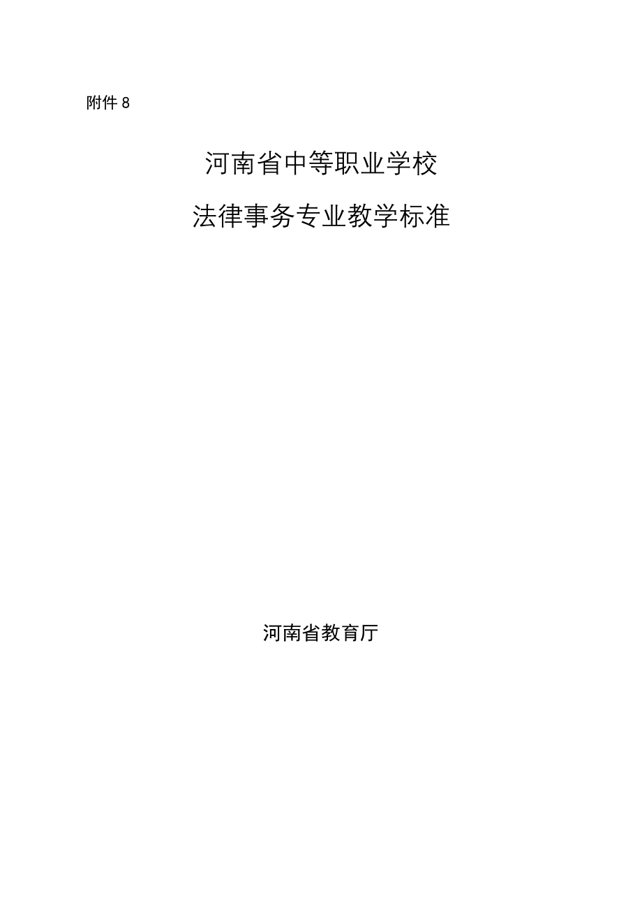 附件8河南省中等职业学校法律事务专业教学标准河南省教育厅目 录一、法律事务专业教学标准……………………………………………………………(1)(一)专业名称 ……………………………………………………………………(1)(二)入学要求 ……………………………………………………………………(1)(三)基本学制……………………………………………………………………(1)(四)培养目标……………………………………………………………………(1)(五)职业范围……………………………………………………………………(1)(六)人才规格 ……………………………………………………………………(2)(七)主要接续专业………………………………………………………………(4)(八)课程结构……………………………………………………………………(4)(九)课程设置及要求……………………………………………………………(4)(十)教学时间安排………………………………………………………………(11)(十一)教学实施…………………………………………………………………(13)(十二)成绩考核…………………………………………………………………(14)(十三)实训实习环境……………………………………………………………(14)(十四)专业师资…………………………………………………………………(15)(十五)其他………………………………………………………………………(15)二、法律事务专业主干课程教学标准………………………………………………(16) 《中国宪法》课程标准………………………………………………………(16) 《中国民法》课程标准………………………………………………………(19) 《中国民事诉讼法》课程标准……………………………………………(23) 《中国刑法学教程》课程标准……………………………………………(28) 《中国刑事诉讼法教程》课程标准……………………………………………(36) 《行政法与行政诉讼法》课程标准…………………………………………(43) 《逻辑学》课程标准…………………………………………………………(52) 《中国婚姻法》课程标准……………………………………………………(60) 《法学基础理论与应用》课程标准…………………………………………(64) 《中国合同法教程》课程标准…………………………………………(67) 《经济法》课程标准……………………………………………………(72) 《劳动法》课程标准………………………………………………………(77)《知识产权法》课程标准…………………………………………………(81) 《司法文书》课程标准……………………………………………………(87)《物权法》课程标准………………………………………………………(97)附 录 1河南省中等职业学校法律事务专业教学标准研究与开发报告 ………(124) 2.河南省中等职业学校法律事务专业教学标准开发项目组成员名单…(134)121一、中等职业学校法律事务专业教学标准 (一)专业名称 专业名称:法律事务 专业代码:170100 (二)入学要求初中毕业生及同等学历者 (三)基本学制3年 (四)培养目标,法律事务专业培养拥护党的基本路线,德、智、体、美等方面全面发展,具有良好的综合素质,具有良好的职业道德,具有实用性法律专业知识和熟练的专业技能,系统掌握法学基本理论、法律专业知识和熟练的专业技能,具有良好身体素质和心理素质的人才。