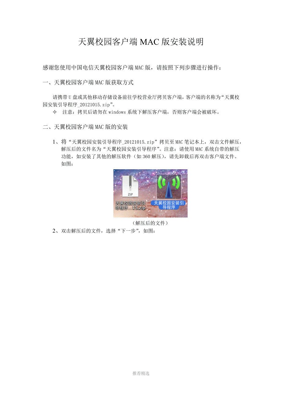 天翼校园客户端MAC版安装说明感谢您使用中国电信天翼校园客户端MAC版,请按照下列步骤进行操作:一、 天翼校园客户端MAC版获取方式 请携带U盘或其他移动存储设备前往学校营业厅拷贝客户端,客户端的名称为“天翼校园安装引导程序_20121015.zip”² 注意:拷贝后请勿在windows系统下解压客户端,否则客户端会被破坏二、 天翼校园客户端MAC版的安装1、 将“天翼校园安装引导程序_20121015.zip”拷贝至MAC笔记本上,双击文件解压,解压后的文件名为“天翼校园安装引导程序”注意:请使用MAC系统自带的解压功能,如安装了其他的解压软件(如360解压),请先卸载后再双击客户端文件如图:(解压后的文件)2、 双击解压后的文件,选择“下一步”,如图:推荐精选3、 选择“安装”,如图:4、 输入当前管理员的密码(由于客户端需要安装系统服务,必须要输入管理员密码,无没有设置需先设置密码),点击“安装软件”,如图:推荐精选² 注意:如没有设置管理员密码,可在系统下依次打开“系统偏好设置”→“系统”→“用户与群组”,选中当前的管理员帐号点击“更改密码”,旧密码处不填,在新密码处输入需要设置的密码。