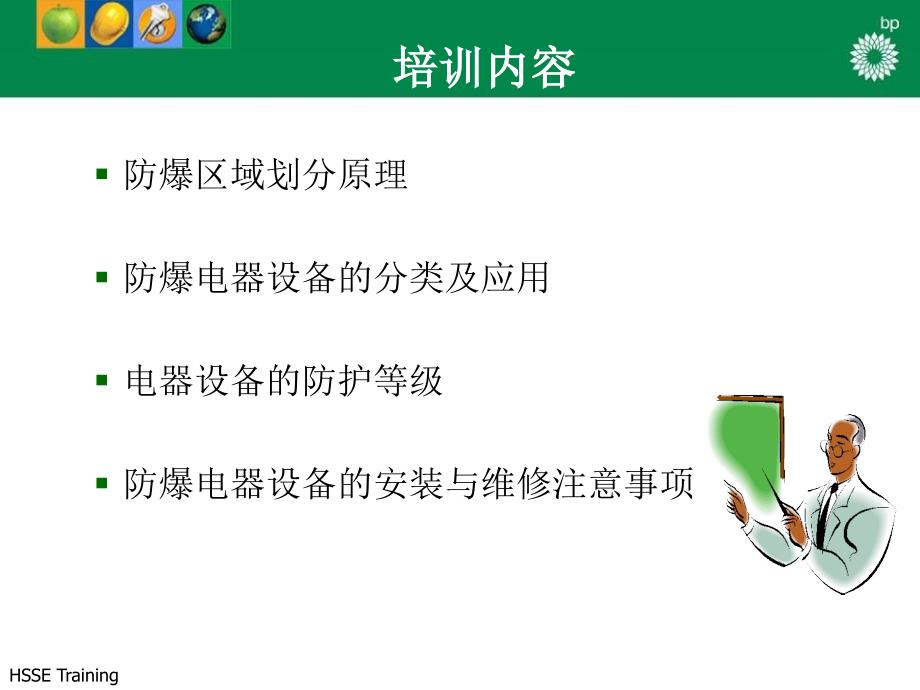 HSSE Training培训内容培训内容防爆区域划分原理防爆电器设备的分类及应用电器设备的防护等级防爆电器设备的安装与维修注意事项HSSE Training爆炸性气体环境危险区域划分0区:连续出现或长期出现爆炸性气体混合物的环境;l区:在正常运行时可能出现爆炸性气体混合物的环境;2区:在正常运行时不可能出现爆炸性气体混合物的环境,或即使出现也仅是短时存在的爆炸性气体混合物的环境HSSE Training非爆炸危险区域 没有释放源并不可能有易燃物质侵入的区域;易燃物质可能出现的最高浓度不超过爆炸下限值的10;在生产过程中使用明火的设备附近,或炽热部件的表面温度超过区域内易燃物质引燃温度的设备附近;在生产装置区外,露天或开敞设置的输送易燃物质的架空管道地带,但其阀门处按具体情况定HSSE Training释放源分级 连续级释放源:预计长期释放或短时频繁释放的释放源第一级释放源:预计正常运行时周期或偶尔释放的释放源第二级释放源:预计在正常运行下不会释放,即使释放也仅是偶尔短时释放的释放源多级释放源:由上述两种或三种级别释放源组成的释放源HSSE Training分区方法 按下列释放源的级别划分区域:存在连续级释放源的区域可划为0区;存在第一级释放源的区域可划为1区;存在第二级释放源的区域可划为2区。