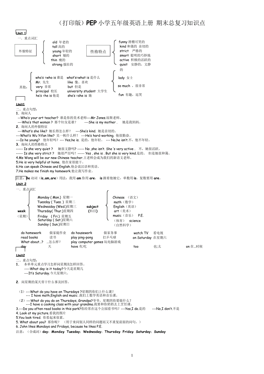 (打印版)PEP 小学五年级英语上册 期末总复习知识点 Unit 1 一.重点词汇 old 年老的 tall 高的 young 年轻的 short 矮的 thin 瘦的 strong 强壮的 funny 滑稽可笑的 kind 和蔼的 亲切的 strict 严格的 smart 聪明的巧妙地 active 积极的活跃的 quiet 安静的,文静的 其他: who’s =who is 谁是 Mr. 先生 very 非常 principal 校长 he’s =he is 他是 what’s=what is 是什么 like 像、喜欢 but 但是 university student 大学生 she’s =she is 她 lady 女士 so much ,很非常 fun 有趣,逗笑 Unit1 二、重点句型: 1. 询问人 --Who’s your art teacher? 谁是你的美术老师---Mr Jones.琼斯老师 ---Who’s that woman ? 那个妇女是谁? ---She is my mother . 她是我妈妈 2. 询问人的外貌特征 ---What’s she like? 她长得怎么样? ---She’s kind. 她是亲切的。