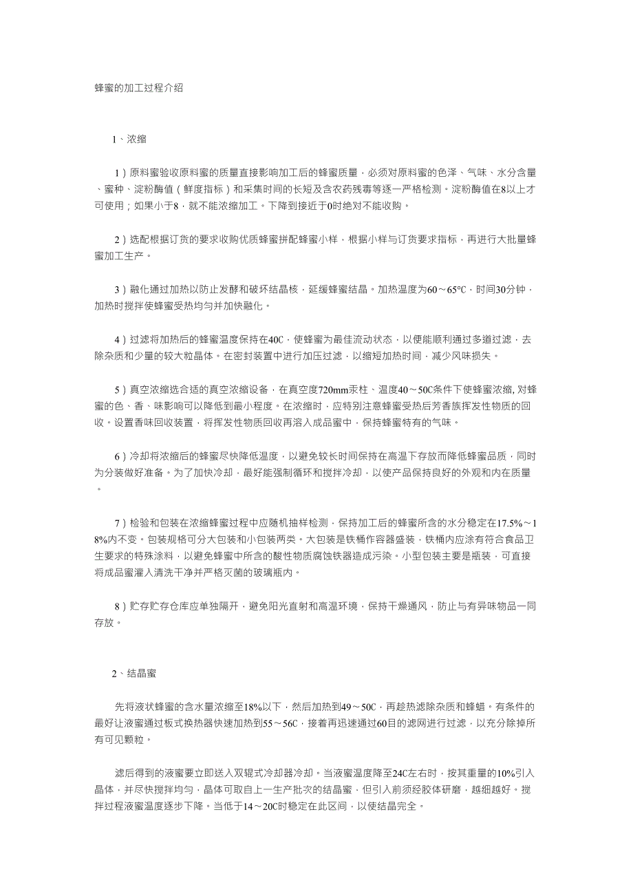为了加快冷却,最好能强制循环和搅拌冷却,以使产品保持良好的外观和内在质量7)检验和包装在浓缩蜂蜜过程中应随机抽样检测,保持加工后的蜂蜜所含的水分稳定在17.5%〜18%内不变包装规格可分大包装和小包装两类大包装是铁桶作容器盛装,铁桶内应涂有符合食品卫生要求的特殊涂料,以避免蜂蜜中所含的酸性物质腐蚀铁器造成污染小型包装主要是瓶装,可直接将成品蜜灌入清洗干净并严格灭菌的玻璃瓶内8)贮存贮存仓库应单独隔开,避免阳光直射和高温环境,保持干燥通风,防止与有异味物品一同存放2、结晶蜜先将液状蜂蜜的含水量浓缩至18%以下,然后加热到49〜50C,再趁热滤除杂质和蜂蜡有条件的最好让液蜜通过板式换热器快速加热到55〜56C,接着再迅速通过60目的滤网进行过滤,以充分除掉所有可见颗粒滤后得到的液蜜要立即送入双辊式冷却器冷却当液蜜温度降至24C左右时,按其重量的10%引入晶体,并尽快搅拌均匀,晶体可取自上一生产批次的结晶蜜,但引入前须经胶体研磨,越细越好搅拌过程液蜜温度逐步下降当低于14〜20C时稳定在此区间,以使结晶完全品种引入后的2〜3天,每天仍要搅拌数次,10〜15天后即可灌装、密封需注意的是,在结晶蜜加工中,结晶温度的掌握、品种的粗细及分布均匀与否是生产的关键。
