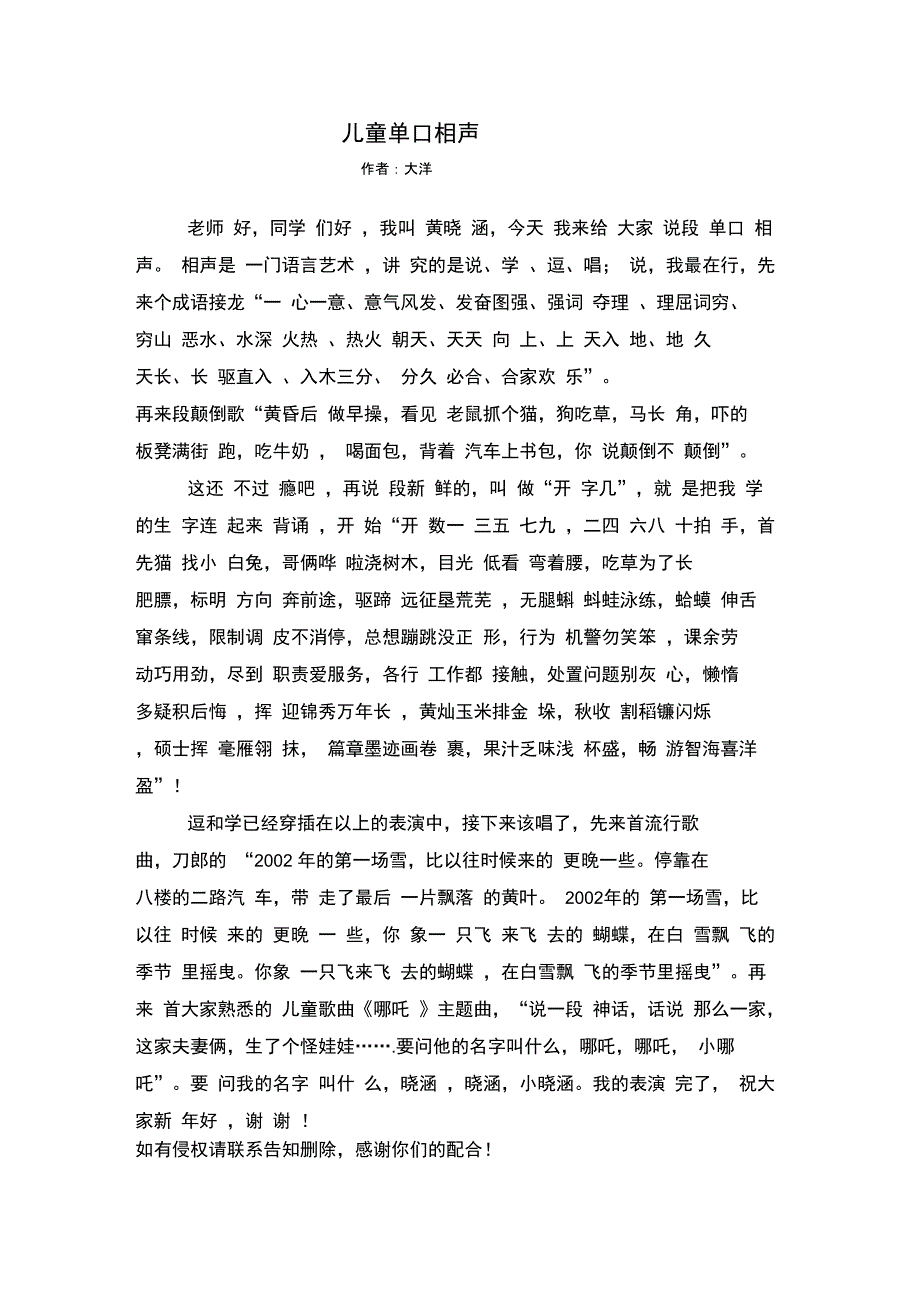 儿童单口相声作者:大洋老师 好,同学 们好 ,我叫 黄晓 涵,今天 我来给 大家 说段 单口 相 声 相声是 一门语言艺术 ,讲 究的是说、学 、逗、唱; 说,我最在行,先 来个成语接龙“一 心一意、意气风发、发奋图强、强词 夺理 、理屈词穷、 穷山 恶水、水深 火热 、热火 朝天、天天 向 上、上 天入 地、地 久 天长、长 驱直入 、入木三分、 分久 必合、合家欢 乐” 再来段颠倒歌“黄昏后 做早操,看见 老鼠抓个猫,狗吃草,马长 角,吓的 板凳满街 跑,吃牛奶 , 喝面包,背着 汽车上书包,你 说颠倒不 颠倒”这还 不过 瘾吧 ,再说 段新 鲜的,叫 做“开 字几”,就 是把我 学 的生 字连 起来 背诵 ,开 始“开 数一 三五 七九 ,二四 六八 十拍 手,首 先猫 找小 白兔,哥俩哗 啦浇树木,目光 低看 弯着腰,吃草为了长 肥膘,标明 方向 奔前途,驱蹄 远征垦荒芜 ,无腿蝌 蚪蛙泳练,蛤蟆 伸舌 窜条线,限制调 皮不消停,总想蹦跳没正 形,行为 机警勿笑笨 ,课余劳 动巧用劲,尽到 职责爱服务,各行 工作都 接触,处置问题别灰 心,懒惰 多疑积后悔 ,挥 迎锦秀万年长 ,黄灿玉米排金 垛,秋收 割稻镰闪烁 ,硕士挥 毫雁翎 抹, 篇章墨迹画卷 裹,果汁乏味浅 杯盛,畅 游智海喜洋 盈”!逗和学已经穿插在以上的表演中,接下来该唱了,先来首流行歌 曲,刀郎的 “2002 年的第一场雪,比以往时候来的 更晚一些。