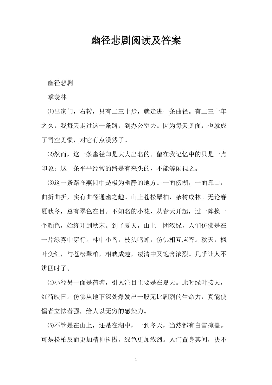 幽径悲剧阅读及答案 幽径悲剧 季羡林 ⑴出家门,右转,只有二三十步,就走进一条曲径有二三十年之久,我每天走过这一条路,到办公室去因为每天见面,也就成了司空见惯,对它有点漠然了 ⑵然而,这一条幽径却是大大出名的留在我记忆中的只是一点印象:这一条平平经常的路是有来头的,不能等闲视之 ⑶这一条路在燕园中是极为幽静的地方一面傍湖,一面靠山,曲折曲折,实有曲径通幽之趣山上苍松翠柏,杂树成林无论春夏秋冬,总有翠色在目不知名的小花,从春天开起,过一阵换一个颜色,始终开到秋末到了夏天,山上一团浓绿,人们仿佛是在一片绿雾中穿行林中小鸟,枝头鸣蝉,仿佛相互应答秋天,枫叶变红,与苍松翠柏,相映成趣,凄清中又饱含浓烈几乎让人不辨四时了 ⑷小径另一面是荷塘,引人注目主要是在夏天此时绿叶接天,红荷映日仿佛从地下深处爆发出一股无比剧烈的生命力,真能使懦者立怯者强,给人以无穷的感染力 ⑸不管是在山上,还是在湖中,一到冬天,当然都有白雪掩盖可是松柏反而更加精神抖擞,绿色更加浓烈人们置身其间,决不会感到冬天的萧索了 ⑹这一条奇妙的幽径,状况大抵如此 ⑺在全部的这些奇妙的东西中,给我印象最深、让我最留恋难忘的是一株古藤萝。