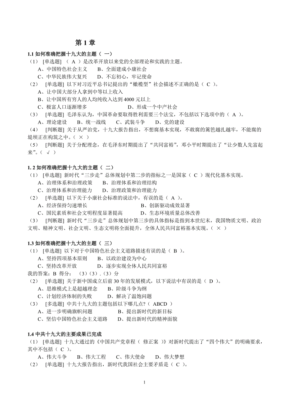 第1章1.1如何准确把握十九大的主题( 一)(1) [单选题] ( A )是改革开放以来党的全部理论和实践的主题A、中国特色社会主义 B、全面建成小康社会C、中华民族伟大复兴 D、不忘初心,牢记使命(2) [单选题] 以下对习近平总书记提出的“橄榄型”社会描述不正确的是( C )A、让中国大部分人拿到中等以上收入 B、让中国所有穷人的人均纯收入达到4000元以上C、极富人口逐渐增多 D、形成一个中产社会(3) [单选题] 毛泽东认为,中国革命要取得胜利需要三个法宝,不包括以下选项中的( A )A、理论建设 B、统一战线 C、武装斗争 D、党的建设(4) [判断题] 关于从严治党,十九大报告指出,不想腐基本实现,不敢腐的篱笆越扎越牢,不能腐的堤坝正在构筑之中 )(5) [判断题] 关于分配理念,在毛泽东时期提出了“共同富裕”,邓小平时期提出了“让少数人先富起来” √ )1. 2如何准确把握十九大的主题( 二)(1) [单选题] 新时代“三步走”总体规划中第二步的指标之一是国家( C )现代化基本实现A、治理体系和治理政策 B、治理体系和治理结构C、治理体系和治理能力 D、治理政策和治理能力(2) [单选题] 以下关于小康社会标准的说法中,有误的是( A )。
