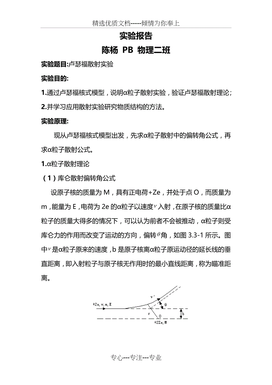 精选优质文档-----倾情为你奉上实验报告陈杨 PB 物理二班实验题目:卢瑟福散射实验实验目的: 1.通过卢瑟福核式模型,说明α粒子散射实验,验证卢瑟福散射理论; 2.并学习应用散射实验研究物质结构的方法实验原理: 现从卢瑟福核式模型出发,先求α粒子散射中的偏转角公式,再求α粒子散射公式1.α粒子散射理论(1)库仑散射偏转角公式设原子核的质量为M,具有正电荷+Ze,并处于点O,而质量为m,能量为E,电荷为2e的α粒子以速度入射,在原子核的质量比α粒子的质量大得多的情况下,可以认为前者不会被推动,α粒子则受库仑力的作用而改变了运动的方向,偏转角,如图3.3-1所示图中是α粒子原来的速度,b是原子核离α粒子原运动径的延长线的垂直距离,即入射粒子与原子核无作用时的最小直线距离,称为瞄准距离图3.3-1 α粒子在原子核的库仑场中路径的偏转当α粒子进入原子核库仑场时,一部分动能将改变为库仑势能设α粒子最初的的动能和角动量分别为E和L,由能量和动量守恒定律可知: (1) (2)由(1)式和(2)式可以证明α粒子的路线是双曲线,偏转角θ与瞄准距离b有如下关系: (3)设,则 (4)这就是库仑散射偏转角公式。