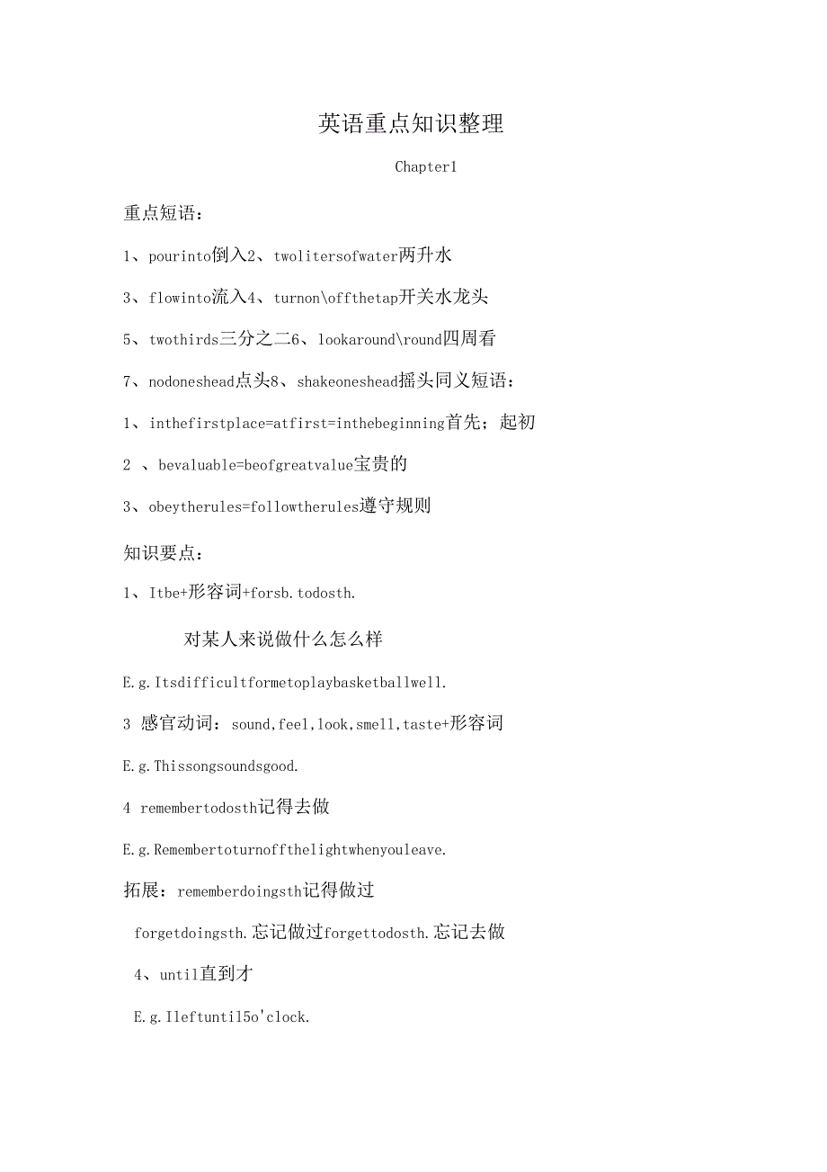 英语重点知识整理Chapter1重点短语:1、pourinto倒入2、twolitersofwater两升水3、flowinto流入4、turnon\offthetap开关水龙头5、twothirds三分之二6、lookaround\round四周看7、nodoneshead点头8、shakeoneshead摇头同义短语:1、inthefirstplace=atfirst=inthebeginning首先;起初2 、bevaluable=beofgreatvalue宝贵的3、obeytherules=followtherules遵守规则知识要点:1、Itbe+形容词+forsb.todosth.对某人来说做什么怎么样E.g.Itsdifficultformetoplaybasketballwell.3 感官动词:sound,feel,look,smell,taste+形容词E.g.Thissongsoundsgood.4 remembertodosth记得去做E.g.Remembertoturnoffthelightwhenyouleave.拓展:rememberdoingsth记得做过forgetdoingsth.忘记做过forgettodosth.忘记去做4、until直到才E.g.Ileftuntil5o'clock.5、spend(spent)on花费pay(paid)for付款E.g.Ispenttwentyyuanonthebook.Ipaidtwentyyuanforthebook.语法:Therebe句型Thereis+单数不可数(alotof,some,little,much,alittle,no)Thereare+复数(alotof,some,afew,few,no,many)Howmuch+单数不可数Howmany+复数同义句:1、Lilyfroze.Lilywasfrightenedandstoppedmovingsuddenly.2、Ispent20yuanonthebook.Ipaid20yuanforthebook.3、Iwaiteduntilyoucalledme.Ididn'tleaveuntilyoucalledme.4、Wecleaneduptheclassroomthismorning.Wemadetheclassroomcleanthismorning.5、Watercomesfromtheseainthefirstplace.Watercomesfromtheseaatfirst.6、Oxygenisvaluable.Oxygenisofgreatvalue.Chapter2重点短语:1、holdameeting开会2、millionsof数百万的3、decidetodosth.决定做某事4、askfor请求5、takenote做笔记6、voteforsb.投票给某人7、inoneweek'stime一周以后8、takepartin参力口同义短语:1、takechargeof=beresponsiblefor=beinchargeof负责2、ought(not)to=should(not)(不)应该3、consider=think(thought)about考虑4、consider=finish完成5lendsb.sth.=lendsth.tosb.=borrowsth.fromsb.6、briefly=inafewwords简单的7、 takeover=discuss讨论知识要点:1、hold(held)举行holdameeting=haveameetingE.g.Weheldameetinglastweek.2、decidetodosth.决定做某事makeadecision做决定E.g.Idecidedtogetupearlyeveryday.3、suggestv.建议suggestionn.advisev.建议advicen.用法:suggestdoingsth.advisetodosth.4、free免费的befreeto对免费E.g.Thesenewspapersarefreetopeople.扩展:free空闲的反义词:busy忙碌5、whatabout\howabout怎么样常用来征求对方的看法或意见,后面可接名词、代词或动名词E.g.What\Howaboutplayingbasketball?语法:how\what用法How+形容词或副词+主语+谓语E.g.Howtallheis!What+名词或名词短语+主语+谓语E.g.Whatatallboyheis!转换:Sheisabeautifulgirl.Howbeautifulsheis!Whatabeautifulgirlsheis!注意:weather、fun、time不可数E.g.Whatniceweatheritis!同义句:1、Wemadeadecisiontohaveameetingnextweek.Wedecidedtohaveameetingnextweek.2、Theyconsideredthelastquestion.Theythoughtaboutthelastquestion.3、Timwasabsenttoday.Timwasnotheretoday.4、Arthurisresponsiblefortakingnotes.Arthurtakeschargeoftakingnotes.Arthurisinchargeoftakingnotes.5、Wearetalkingaboutthisquestionnow.Wearediscussingthisquestionnow.Chapter3重点短语:搜索信息寻找否认做某事1 .workas从事工作2.getinformation3 .protecttheinnocent保护无辜者4.lookfor5 .findtheguilty找到罪犯6.denydoingsth.7 .admit(to)doingsth.承认做某事8 .noticesb.doingsth.留意到•…正在做某事同义短语:把某物给某人看1. insteadof=inplaceof代替2. showsth.tosb.=showsb.sth.3. nolonger=notanylonger=not4. questionsb.=asksb.somequestionsanymore不再提问某人知识要点:1. alone(adv.)独自lonely(adj.)孤独的alone=byoneself=onone'sown独自E.g.Helivesalone,buthedoesn'tfeellonely.2. recent(adj.)最近的recently(adv.)最近地E.g.Pleasetellmeyourrecentlife.语法:动词不定式和动名词动词不定式:动词+todoE.g.Hewantstobeadoctorinthefuture.ShecametoBeijinglastyear.Iagreedtogowithhim.动名词:动词+doingE.g.Ienjoylisteningtothemusic.Headmittedstealingherpurse.Theysuggestedgoingtothepark.注思:1.大部分动词用动词不定式,少部分动词用动名词;2.1 et、make后面直接加do;3.有一些特殊动词不定式句子:MyfatherhelpsmelearnEnglish.Mr.Linletusfinishitbyourselves.IsawPeterenterthebank.IoftenhearLilysingsongs.Thebossmadetheworkerswork16hoursadaylastweek.句型:Its+adj.+todosth.E.g.It’stimetohavelunch.It’seasytogetfattoeattoomuchsweet.It'harmfultoyourhealthtosmokealot.同义句:7. WestudyEnglishaswellasChinese.WestudyEnglishandChinese.8. Igotoschoolbybusinsteadofbycar.Igotoschoolbybusinplaceofbycar.9. Heisnolongerastudent.Heisntastudentanylonger.Heisn’tastudentanymore.10. Thedetectivequestionedher.Thedetectiveaskedhersomequestions.Chapter4重点短语:1.inone'sopinion按某人的意见2.beunawareof不知道3.theanswerto的答案4.raiseaquestion提出问题1. .moreimportantly更重要的是2. .forthesereasons由于这些原因同义短语:1. tiny=verysmall极小的2. dependenton=relyon依赖于3. rarely=seldom很少4. hardlyever=seldom几乎不5. forthetimebeing=now暂时知识要点:5. operate=makesth.work操作拓展:operateonsb.给某人做手术6. beunawareof不知道E.g.Iamunawareof=Idontknow7. inonesopinion按某人的意见来看E.g.Inmyopinion,heisright.=Ithinkheisright.8. theanswerto(n.)的答案answer(v.)回答E.g.Theanswertothisquestionis24.Heanswersthequestion.语法:形容词的比较级和最高级构成:1.一般直接在形容词后加er\est1 .以e结尾直接加r\st2 .以辅音字母结尾加y,把y变i,加er\est3 .重读闭音节结尾,双写辅音字母,再加er\est4 .不规则(要熟记)、,、上~、、>▲注思:(1)比较词前加much表示程度上的差别E.g.TonyismuchtallthanPeter.(2)最高级后面可用in,of,among等来说明比较范围E.g.1.Jingji100isthetallestbuildingintheShenzhen.(1) Thisappleisthebiggestofall.(2) Maryistheyoungestamongthem.Chapter5重点短语:1 .rushdown冲下2.runacompetition举办——个比赛2 .secondslater几秒种后4.bymidnight到了半夜5.exceptfor除了6.makejokesabout讲。