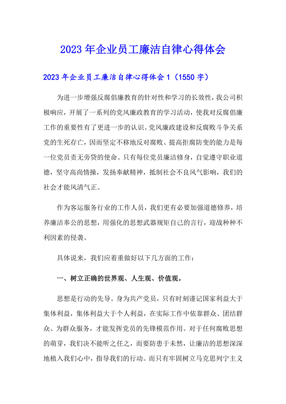 四、抵制各种诱惑侵蚀,增强自身党性修养 唐太宗说过,以人为镜,可以明得失所以在实际工作中,我们要有务实求真的精神,正确对待名利得失,把防腐拒变、廉政勤政当做头等大事,虚心听取群众意见,把群众的批评当做无价之宝,秉承有则改之,无则加勉的态度提升自己的作风和能力,并将群众的评价作为自己工作开展效果的考量,以此来抵制社会上各种五光十色的诱惑同时,要不断学习,提高自身党性修养,做到居安思危、恪尽职守,堂堂正正做人,踏踏实实做事,永葆共产党人的政治本色和浩然正气 总之,廉洁应是共产党人生命的第一要义,我们必须加强自我约束和监督,以实际行动反腐倡廉,使工作更阳光!2023年企业员工廉洁自律心得体会2(1271字) 经过公司组织的廉洁教育学习和看完宣教片后心得体会如下: 一、加强法制学习 经过学习让我认识到许多违反原则、违反纪律的事情,甚至有些不正之风和腐败行为,都与对相关制度和规定无知有关所以,必须熟悉和掌握党和国家关于工程建设的各项制度和规定,提高按制度和规定办事的自觉性在工作中,要加强学习法制知识,依法办事,坚持在法律面前人人平等,任何组织和个人都不能超越法律,做懂法用法守法的党员干部。