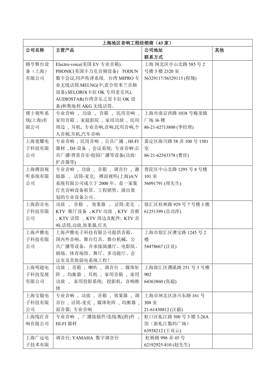 上海地区音响工程经销商(43家)公司名称主营产品公司地址联系方式其他路亨舞台设备(上海)有限公司Electro-voice(美国EV专业音箱).PHONIC(美国丰力克音频设备) TODUN数字会议,同声传译系统. 台湾MIPRO专业无线话筒.MELNG(中,意合资米兰音频设备).SELORO(卡拉OK专用麦克风),AUDIOSTAR(台湾音乐之星卡拉OK设备)和奥地利AKG无线话筒上海闸北区中山北路585号2号楼3楼2320室56329117/56329115 (程翔)博士视听系统(上海)有限公司专业音响 , 功放 , 音箱 , 民用音响 , 家用音箱 , 家庭影院 , 家用功放 , 民用周边 , 耳机; 专业音响,音响,民用音响,个人音频,耳机,汽车音响上海市南京西路1038号梅龙镇广场36楼86-21-62713800 (李经理)上海宽耀电子科技有限公司专业音响 , 民用音响 , 公共广播 , HI-FI器材 , DJ-设备 , 会议系统; 专业音响\公共广播\背景音乐\校园广播等设备(功放/扩音器等)嘉定区海川路58弄100号1501室86-21-62543378 (曹佳)上海搏浪视听系统有限公司专业音响 , 功放 , 音箱 , 调音台 , 激励器 , 话筒-麦克; 搏浪视听(上海)A/V系统有限公司成立于2000年,是一家集灯光音响设备租赁、工程销售、演出策划的专业设备公司。