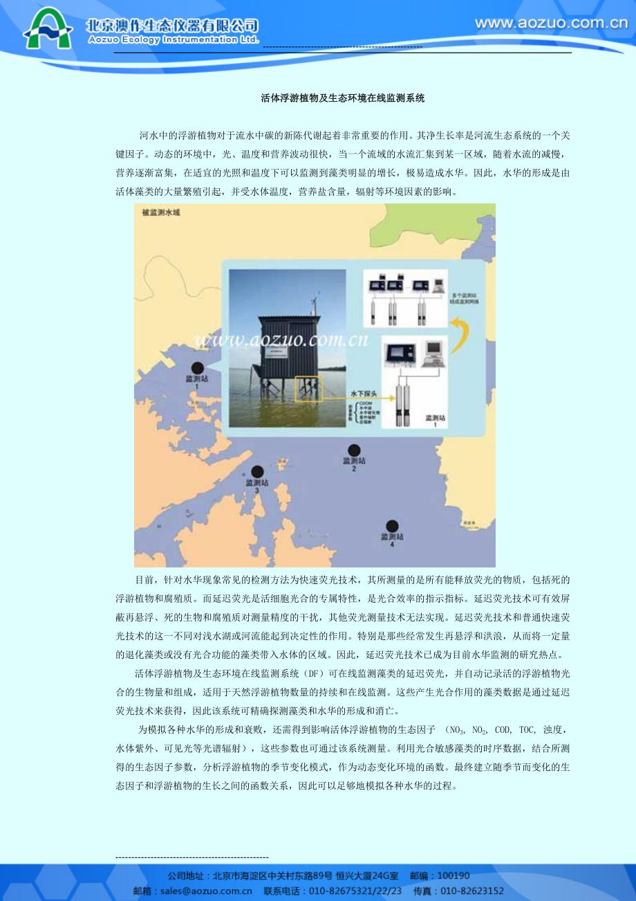 活体浮游植物及生态环境监测系统河水中的浮游植物对于流水中碳的新陈代谢起着非常重要的作用其净生长率是河流生态系统的一个关键因子动态的环境中,光、温度和营养波动很快,当一个流域的水流汇集到某一区域,随着水流的减慢,营养逐渐富集,在适宜的光照和温度下可以监测到藻类明显的增长,极易造成水华因此,水华的形成是由活体藻类的大量繁殖引起,并受水体温度,营养盐含量,辐射等环境因素的影响目前,针对水华现象常见的检测方法为快速荧光技术,其所测量的是所有能释放荧光的物质,包括死的浮游植物和腐殖质而延迟荧光是活细胞光合的专属特性,是光合效率的指示指标延迟荧光技术可有效屏蔽再悬浮、死的生物和腐殖质对测量精度的干扰,其他荧光测量技术无法实现延迟荧光技术和普通快速荧光技术的这一不同对浅水湖或河流能起到决定性的作用特别是那些经常发生再悬浮和洪浪,从而将一定量的退化藻类或没有光合功能的藻类带入水体的区域因此,延迟荧光技术已成为目前水华监测的研究热点活体浮游植物及生态环境监测系统(DF)可监测藻类的延迟荧光,并自动记录活的浮游植物光合的生物量和组成,适用于天然浮游植物数量的持续和监测这些产生光合作用的藻类数据是通过延迟荧光技术来获得,因此该系统可精确探测藻类和水华的形成和消亡。