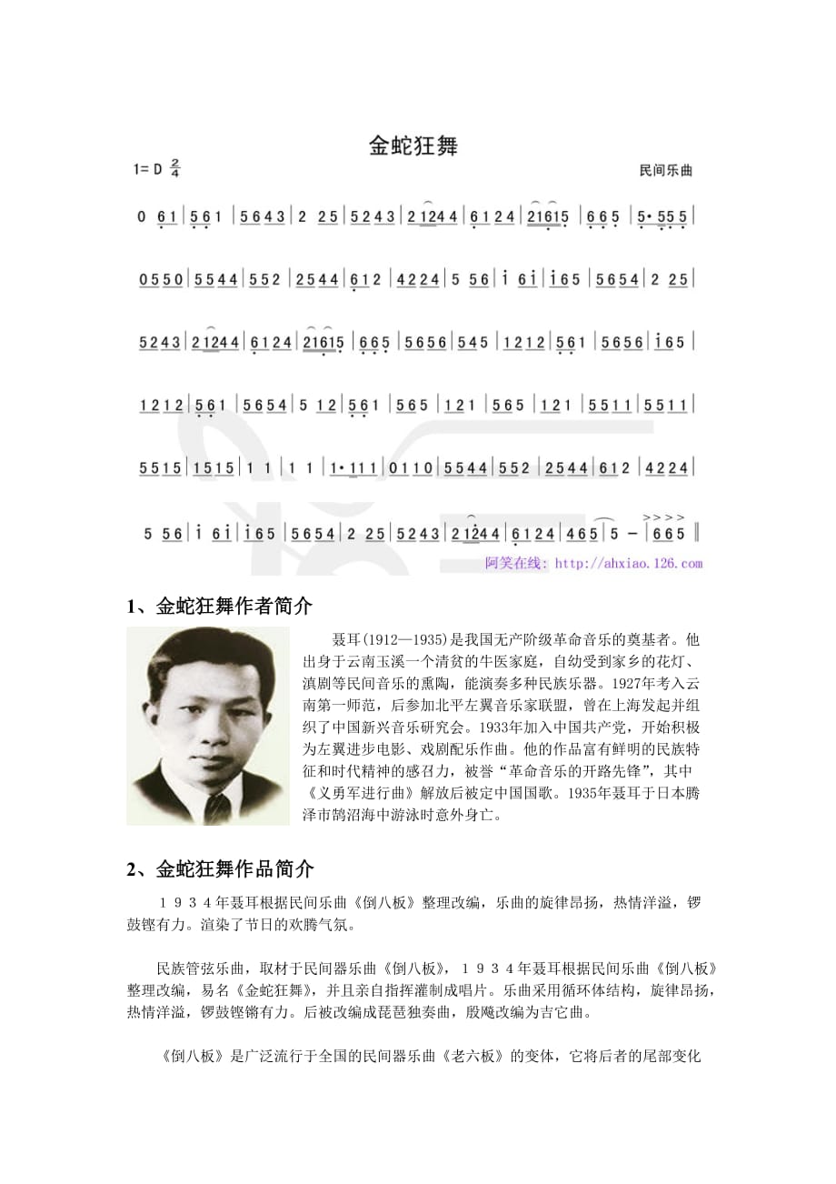 1、 金蛇狂舞作者简介 聂耳(1912—1935)是我国无产阶级革命音乐的奠基者他出身于云南玉溪一个清贫的牛医家庭,自幼受到家乡的花灯、滇剧等民间音乐的熏陶,能演奏多种民族乐器1927年考入云南第一师范,后参加北平左翼音乐家联盟,曾在上海发起并组织了中国新兴音乐研究会1933年加入中国共产党,开始积极为左翼进步电影、戏剧配乐作曲他的作品富有鲜明的民族特征和时代精神的感召力,被誉“革命音乐的开路先锋”,其中《义勇军进行曲》解放后被定中国国歌1935年聂耳于日本腾泽市鹄沼海中游泳时意外身亡2、 金蛇狂舞作品简介 1934年聂耳根据民间乐曲《倒八板》整理改编,乐曲的旋律昂扬,热情洋溢,锣鼓铿有力渲染了节日的欢腾气氛 民族管弦乐曲,取材于民间器乐曲《倒八板》,1934年聂耳根据民间乐曲《倒八板》整理改编,易名《金蛇狂舞》,并且亲自指挥灌制成唱片乐曲采用循环体结构,旋律昂扬,热情洋溢,锣鼓铿锵有力后被改编成琵琶独奏曲,殷飚改编为吉它曲 《倒八板》是广泛流行于全国的民间器乐曲《老六板》的变体,它将后者的尾部变化发展,作为乐曲的开始,故俗称《倒八板》 第二段又将原曲中的“工”(即3)更换成“凡”(即4),转入上四度宫调系统,情绪明朗热烈,故也称它为《凡忘工》或《绝工板》。