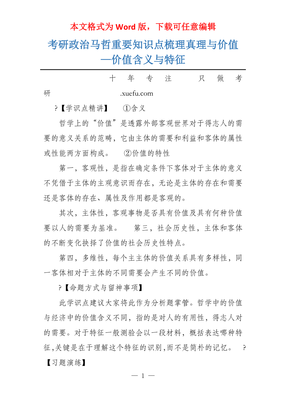 本文格式为Word版,下载可任意编辑考研政治马哲重要知识点梳理真理与价值—价值含义与特征 十年专注 只做考研 ?【学识点精讲】 ①含义 哲学上的“价值”是透露外部客观世界对于得志人的需要的意义关系的范畴,它由主体的需要和利益和客体的属性或性能两方面构成 ②价值的特性 第一,客观性,是指在确定条件下客体对于主体的意义不凭借于主体的主观意识而存在,无论是主体的存在和需要还是客体的存在、属性及作用都是客观的 其次,主体性,客观事物是否具有价值及具有何种价值要以人的需要为基准 第三,社会历史性,主体和客体的不断变化抉择了价值的社会历史性特点 第四,多维性,每个主主体的价值关系具有多样性,同一客体相对于主体的不同需要会产生不同的价值 ?【命题方式与留神事项】 此学识点建议大家将此作为分析题掌管哲学中的价值与经济中的价值含义不同,指的是对人的有用性,得志人对的需要对于特征一般测验会以一段材料,概括表达哪种特征,关键是在于理解这个特征的识别,而不是简朴的记忆。