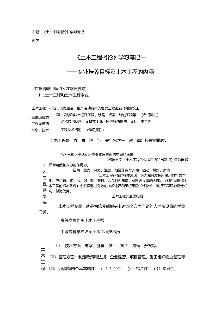 主题:《土木工程概论》学习笔记内容:《土木工程概论》学习笔记一——专业培养目标及土木工程的内涵1专业培养目标和人才素质要求1.1土木工程和土木工程专业土木工程:①指与人类生活、生产活动有关的各类工程设施(如建筑工是建造各类工程设施的科学、技术和工程的总程、公路和城市道路工程、铁路、桥梁、隧道工程等)(名词属性)②指应用材料、设备在土地上所进行的勘测、设计、施工等工程技术活动动词属性)土木工程是“衣、食、住、行”先行官之一,占了举足轻重的地位①为形成人类活动所需要物质方面的空间和通道土木工程需要解决的问题精神方面(土木工程的根本目的和出发点)②为能够抵御自然和人为的作用力自然:重力、风力、温差、地震作用等人为:振动、爆炸、摩擦(土木工程存在的根本原因)③为充分发挥所采用材料的作用应用石、砖、木、钢、砼、塑料、合金材料建造材料占投资的大部材料是建造土木工程的根本条件)④怎样通过有效的技术途径和组织手段“好快省”地把工程设施建造成功,付诸使用土木工程的最终归宿)土木工程专业,就是为培养能解决上述四个方面问题的人才所设置的学业门类高等学校培丞土木工程师中等专科学校培至土木工程技术员土木工程活动(1)技术方面:勘察、测量、设计、施工、监理、开发等。