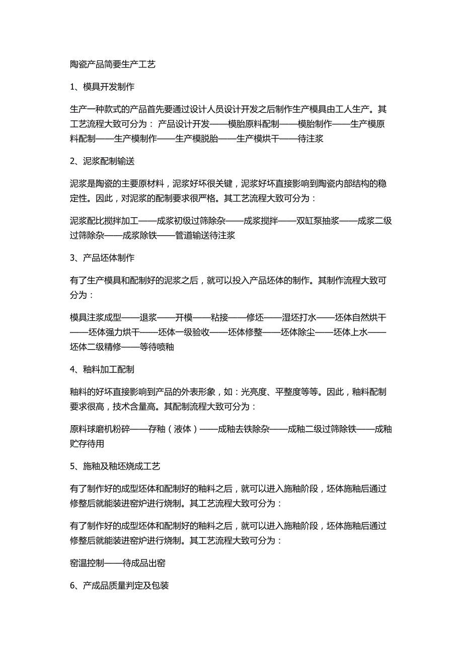 陶瓷产品简要生产工艺 1、模具开发制作 生产一种款式的产品首先要通过设计人员设计开发之后制作生产模具由工人生产其工艺流程大致可分为: 产品设计开发——模胎原料配制— —模胎制作— —生产模原料配制—— 生产模制作— —生产模脱胎——生产模烘干— —待注浆 2、泥浆配制输送 泥浆是陶瓷的主要原材料,泥浆好坏很关键,泥浆好坏直接影响到陶瓷内部结构的稳定性因此,对泥浆的配制要求很严格其工艺流程大致可分为: 泥浆配比搅拌加工—— 成浆初级过筛除杂— —成浆搅拌——双缸泵抽浆— —成浆二级过筛除杂—— 成浆除铁— —管道输送待注浆 3、产品坯体制作有了生产模具和配制好的泥浆之后,就可以投入产品坯体的制作其制作流程大致可分为: 模具注浆成型—— 退浆——开模——粘接— —修坯— —湿坯打水——坯体自然烘干—— 坯体强力烘干— —坯体一级验收——坯体修整— —坯体除尘— —坯体上水——坯体二级精修— —等待喷釉 4、釉料加工配制 釉料的好坏直接影响到产品的外表形象,如:光亮度、平整度等等因此,釉料配制要求很高,技术含量高其配制流程大致可分为: 原料球磨机粉碎—— 存釉(液体)— —成釉去铁除杂——成釉二级过筛除铁— —成釉贮存待用5、施釉及釉坯烧成工艺有了制作好的成型坯体和配制好的釉料之后,就可以进入施釉阶段,坯体施釉后通过修整后就能装进窑炉进行烧制。