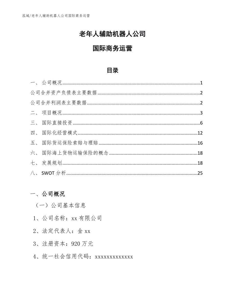 泓域/老年人辅助机器人公司国际商务运营老年人辅助机器人公司国际商务运营目录一、 公司概况 1公司合并资产负债表主要数据 2公司合并利润表主要数据 2二、 项目概况 3三、 国际直接投资 6四、 国际化经营模式 12五、 国际货运保险索赔与理赔 16六、 国际海上货物运输保险的概念 18七、 发展规划 18八、 SWOT分析 25一、 公司概况(一)公司基本信息1、公司名称:xx有限公司2、法定代表人:金xx3、注册资本:920万元4、统一社会信用代码:xxxxxxxxxxxxx5、登记机关:xxx市场监督管理局6、成立日期:2015-4-77、营业期限:2015-4-7至无固定期限8、注册地址:xx市xx区xx(二)公司主要财务数据公司合并资产负债表主要数据项目2020年12月2019年12月2018年12月资产总额4312.833450.263234.62负债总额1906.191524.951429.64股东权益合计2406.641925.311804.98公司合并利润表主要数据项目2020年度2019年度2018年度营业收入10689.438551.548017.07营业利润1708.131366.501281.10利润总额1466.541173.231099.90净利润1099.90857.92791.93归属于母公司所有者的净利润1099.90857.92791.93二、 项目概况(一)项目基本情况1、承办单位名称:xx有限公司2、项目性质:新建3、项目建设地点:xx(待定)4、项目联系人:金xx(二)主办单位基本情况公司始终坚持“人本、诚信、创新、共赢”的经营理念,以“市场为导向、顾客为中心”的企业服务宗旨,竭诚为国内外客户提供优质产品和一流服务,欢迎各界人士光临指导和洽谈业务。