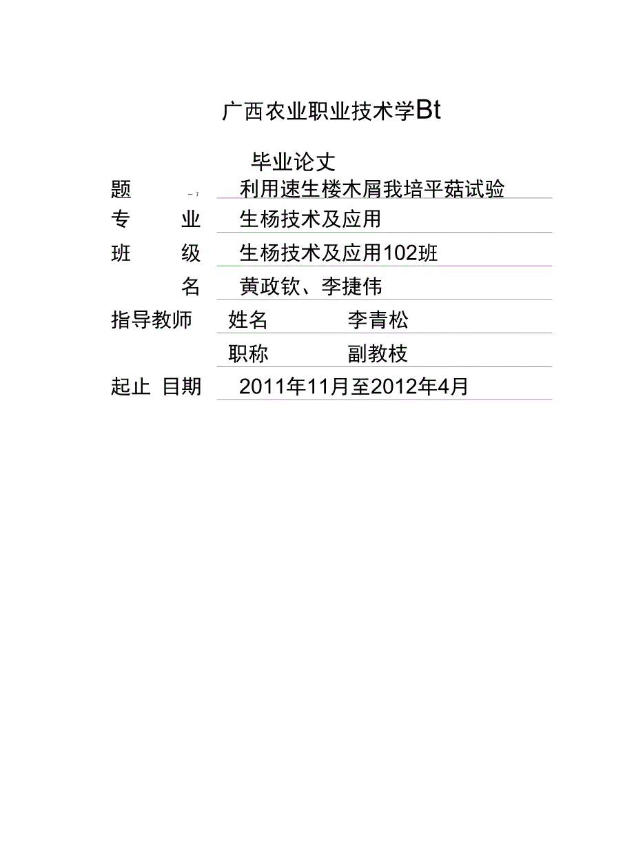 广西农业职业技术学Bt毕业论丈题一 7利用速生楼木屑我培平菇试验专业生杨技术及应用班级生杨技术及应用102班名黄政钦、李捷伟指导教师姓名 李青松职称 副教枝起止目期2011年11月至2012年4月本组声明我们声明,本论文及其设计工作是由本小组在指导教师的指导下独立完成的,在 完成论文时所利用的一切资料均已在参考文献中列出作者(签名)年 月 口目 录1前言 32试验材料与方法 32. 1材料 32. 1. 1试验菌株 32. 1.2设备与用具 32. 2试验培养基 32. 3试验步骤 42. 3. 1原料处理 42. 3. 2 配料 42. 3. 3装袋灭菌 42. 3. 4 接种 52. 3. 5 发菌 52. 3.6出菇管理 52. 3.7 采收 63试验结果与分析 63.1不同处理菌丝生长速度比较 63. 2不同处理鲜菇产量比较 83.3方差分析 104小结与讨论 124.1合理配制培养料 124.2适时开袋 124.3对菌丝及转化率的影响 134.4试验结论 134.5试验意义 13摘 要本小组进行此次试验,目的是探讨添加不同量速生桜木屑栽培平菇,对平菇产量的 影响,以杂木屑为主料,再添加速生桜木屑,改变速生桜木屑的量设计四个处理重复12 次:对照组添加速生枝木屑的量占杂木屑总重量的0%,处理一添加速生枝木屑的量占 杂木屑总重量的38%,处理二添加速生桜木屑的量占杂木屑总重量的19%,处理三添 加速生樓木屑的量占杂木屑总重量的10%,通过试验中的观察记录和结杲分析得到:对 照组菌丝长势最快且菌丝较稀疏,生长速度为0. 528cm/d,生物转化率为9& 79%;处 理一菌丝长势稍慢菌丝很浓密,生长速度为0. 829cm/d,生物转化率为89.39%;处理 二菌丝长势稍慢但菌丝很浓密,生长速度为0. 809cm / d ,生物转化率为87.90%;处理 三菌丝长势较快菌丝浓密,生长速度为0. 837cm / d ,生物转化率为105. 38% o处理三 的配方好,它的鲜菇产量比其他处理的配方均有极显著差异;通过方茅分析,处理二与 对照组相比,差异显著;处理一与对照组相比,差异不显著。