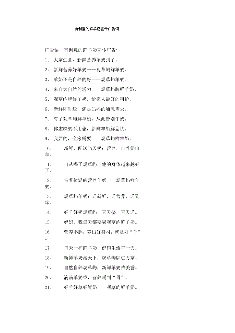 有创意的鲜羊奶宣传广告词广告语,有创意的鲜羊奶宣传广告词1、 大家注意,新鲜营养羊奶到了2、 新鲜营养好羊奶一一观草屿鲜羊奶3、 羊奶还是自养的好一一观草屿羊奶4、 来自大自然的活力一一观草屿牌鲜羊奶5、 观草屿牌鲜羊奶,给家人最好的呵护6、 新鲜即时送,满足妈妈的哺乳需求7、 有了观草屿鲜羊奶,从此告别牛奶8、 体虚缺奶不用愁,新鲜羊奶解您忧9、 我要的,全家需要一一观草屿鲜羊奶10、 新鲜,配送当天奶;营养,自养奶山羊11、 自从喝了观草屿,他的身体越来越好了12、 带着体温的营养羊奶一一观草屿鲜羊奶13、 观草屿羊奶:送新鲜,送营养,送到家14、 好羊好奶观草屿,天天挤,天天送15、 妈妈,我每天都要喝观草屿鲜羊奶16、 营养不胖,养出好身材,就是好“羊”17、 每天一杯鲜羊奶,健康生活每一天18、 新鲜羊奶羸天下,观草屿牌进万家19、 自然自养观草屿,新鲜羊奶传美誉20、 滴滴羊奶香,营养暖到“胃”21、 好羊好草好鲜奶一一观草屿鲜羊奶22、 营养每一天,味你更领鲜23、 老少爷们们,都快来喝新鲜羊奶喽24、 喝观草屿羊奶,享受新鲜的营养25、 自从喝了观草屿,爸的身体越来越好了。