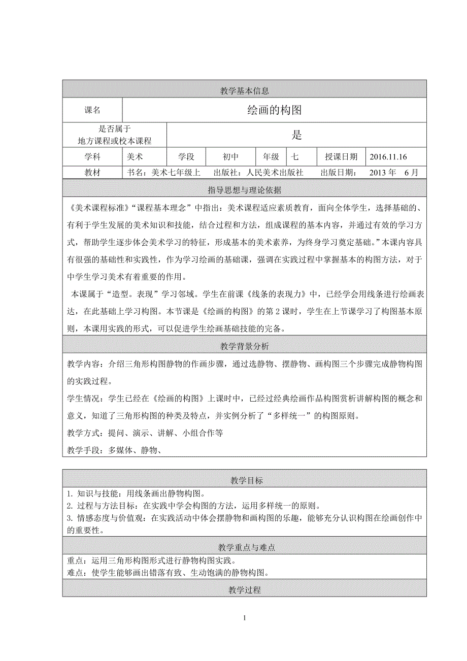 教学基本信息课名绘画的构图是否属于地方课程或校本课程是学科美术学段初中年级七授课日期2016.11.16教材书名:美术七年级上 出版社:人民美术出版社 出版日期: 2013年 6月指导思想与理论依据《美术课程标准》“课程基本理念”中指出:美术课程适应素质教育,面向全体学生,选择基础的、有利于学生发展的美术知识和技能,结合过程和方法,组成课程的基本内容,并通过有效的学习方式,帮助学生逐步体会美术学习的特征,形成基本的美术素养,为终身学习奠定基础本课内容具有很强的基础性和实践性,作为学习绘画的基础课,强调在实践过程中掌握基本的构图方法,对于中学生学习美术有着重要的作用 本课属于“造型表现”学习邻域学生在前课《线条的表现力》中,已经学会用线条进行绘画表达,在此基础上学习构图本节课是《绘画的构图》的第2课时,学生在上节课学习了构图基本原则,本课用实践的形式,可以促进学生绘画基础技能的完备教学背景分析教学内容:介绍三角形构图静物的作画步骤,通过选静物、摆静物、画构图三个步骤完成静物构图的实践过程学生情况:学生已经在《绘画的构图》上课时中,已经过经典绘画作品构图赏析讲解构图的概念和意义,知道了三角形构图的种类及特点,并实例分析了“多样统一”的构图原则。