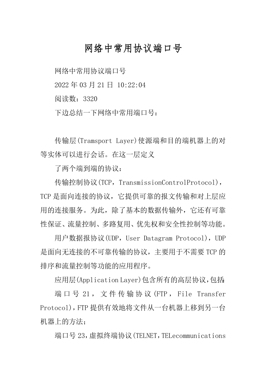 网络中常用协议端口号 网络中常用协议端口号 2022年03月21日 10:22:04 阅读数:3320 下边总结一下网络中常用端口号: 传输层(Tramsport Layer)使源端和目的端机器上的对等实体可以进行会话在这一层定义 了两个端到端的协议: 传输控制协议(TCP,Transmission Control Protocol),TCP是面向连接的协议,它提供可靠的报文传输和对上层应用的连接服务为此,除了基本的数据传输外,它还有可靠性保证、流量控制、多路复用、优先权和安全性控制等功能 用户数据报协议(UDP,User Datagram Protocol),UDP是面向无连接的不可靠传输的协议,主要用于不需要TCP的排序和流量控制等功能的应用程序 应用层(Application Layer)包含所有的高层协议,包括: 端口号21,文件传输协议(FTP,File Transfer Protocol),FTP提供有效地将文件从一台机器上移到另一台机器上的方法; 端口号23,虚拟终端协议(TELNET,TELecommunications NETwork),TELNET允许一台机器上的用户登录到远程机器上,并进行工作; 端口号25,电子邮件传输协议(SMTP,Simple Mail Transfer Protocol),SMTP用于电子邮件的收发; 端口号53,域名服务(DNS,Domain Name Service),DNS用于把主机名映射到网络地址;端口号80,超文本传送协议(HTTP,HyperText Transfer Protocol)等,HTTP用于在WWW 上获取主页。