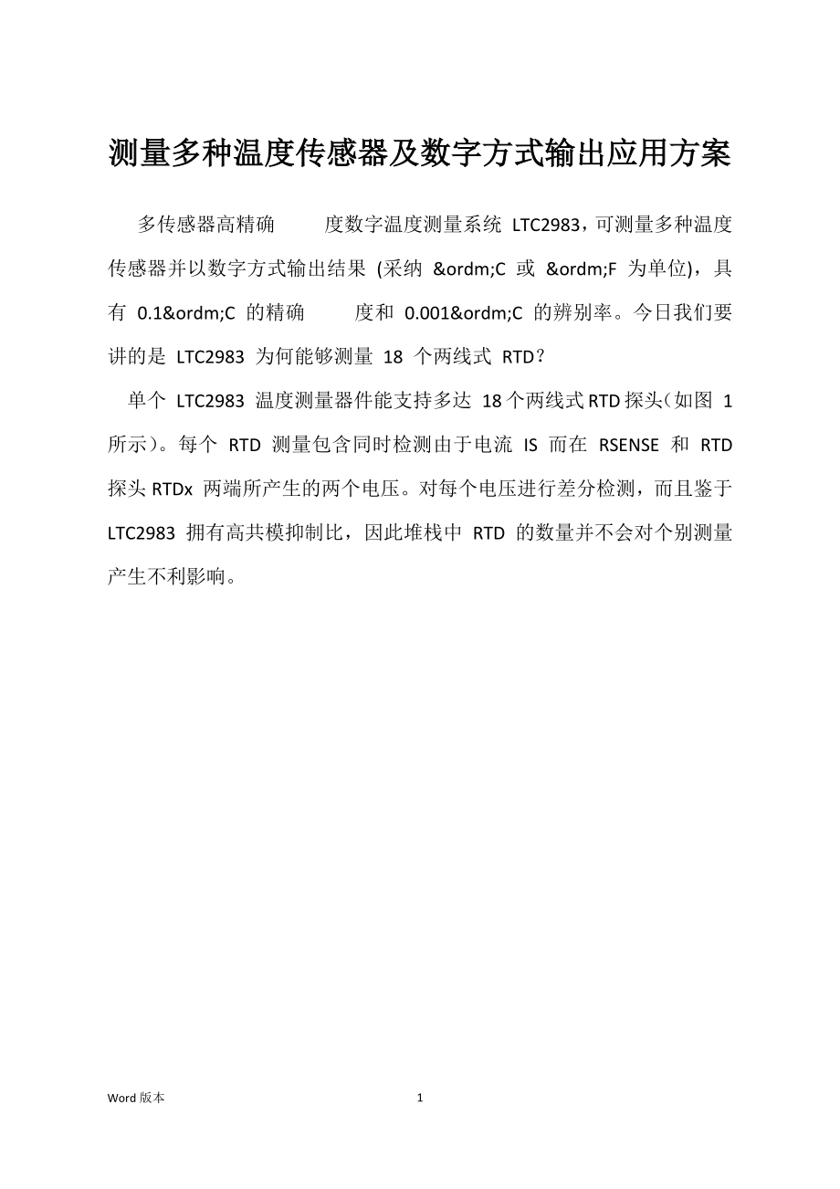 测量多种温度传感器及数字方式输出应用方案 多传感器高精确 度数字温度测量系统 LTC2983,可测量多种温度传感器并以数字方式输出结果 (采纳 ºC 或 ºF 为单位),具有 0.1ºC 的精确 度和 0.001ºC 的辨别率今日我们要讲的是 LTC2983 为何能够测量 18 个两线式 RTD? 单个 LTC2983 温度测量器件能支持多达 18个两线式RTD探头(如图 1 所示)每个 RTD 测量包含同时检测由于电流 IS 而在 RSENSE 和 RTD 探头RTDx 两端所产生的两个电压对每个电压进行差分检测,而且鉴于 LTC2983 拥有高共模抑制比,因此堆栈中 RTD 的数量并不会对个别测量产生不利影响 图1 LTC2983 可支持 18 个 RTD 传感器 RTD 探头的选择取决于系统精确 度和灵敏度要求例如,假设使用的是两线式探头,则可以证明在存在配线寄生电阻的状况下 PT-1000 更加结实一旦选定了 RTD,则应选择合适的 IS 和 RSENSE 以使电阻器堆栈顶端的电压(CH1输入端上的V)在系统的整个工作温度范围内不超过 LTC2983 的输入共模限值。
