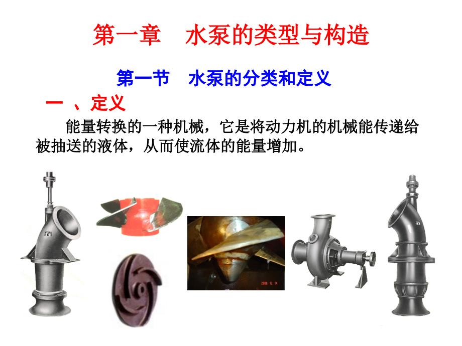 第一章第一章 水泵的类型与构造水泵的类型与构造 第一节第一节 水泵的分类和定义水泵的分类和定义 一一 、定义、定义 能量转换的一种机械,它是将动力机的机械能传递给能量转换的一种机械,它是将动力机的机械能传递给被抽送的液体,从而使流体的能量增加被抽送的液体,从而使流体的能量增加 水水泵泵叶片泵叶片泵离心泵离心泵单级单吸离心泵单级单吸离心泵卧式、立式卧式、立式单级双吸离心泵单级双吸离心泵卧式、立式卧式、立式多级离心泵多级离心泵卧式卧式混流泵混流泵蜗壳式混流泵蜗壳式混流泵卧式、立式卧式、立式导叶式混流泵导叶式混流泵立式、斜式立式、斜式轴流泵轴流泵轴伸式轴流泵轴伸式轴流泵立式、斜式、卧式立式、斜式、卧式贯流式轴流泵贯流式轴流泵卧轴式卧轴式螺旋泵螺旋泵斜轴式斜轴式容积泵容积泵往复泵往复泵活塞泵活塞泵柱塞泵柱塞泵隔膜泵隔膜泵回转泵回转泵齿轮泵齿轮泵螺杆泵螺杆泵其他类型泵其他类型泵水锤泵水锤泵射流泵射流泵水轮泵水轮泵二二 、分类、分类 1 、叶片泵 通过水泵叶轮的旋转把机械能转化为所输送液体的能量通过水泵叶轮的旋转把机械能转化为所输送液体的能量。