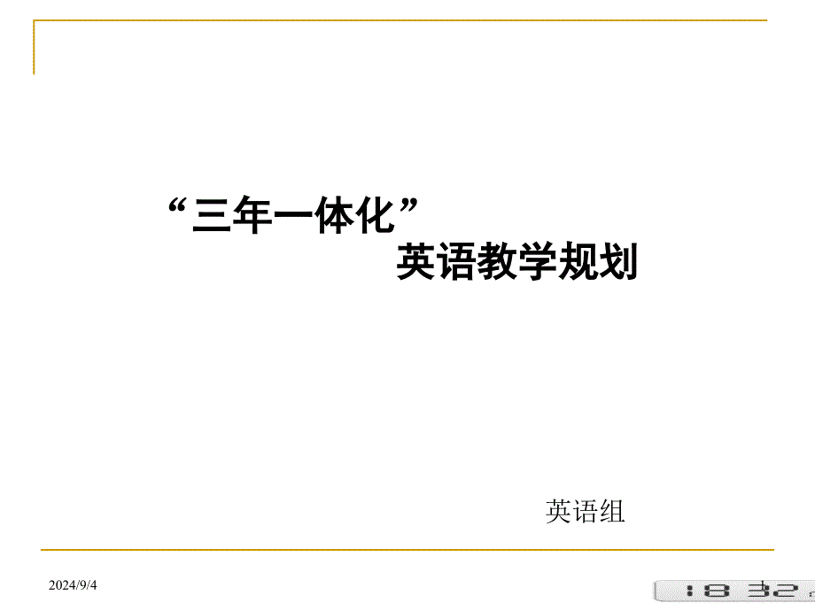 2024/9/41““三年一体化三年一体化”” 英语英语教学规划教学规划英语组2024/9/42 所谓所谓““三年一体三年一体化化””,就是指整个高中三年要对学生,就是指整个高中三年要对学生在在知识、知识、能力、素养能力、素养等方面进行等方面进行通盘思考、系统规划、通盘思考、系统规划、分段落实、逐层推进分段落实、逐层推进的培养,把素质教育、常规教学、的培养,把素质教育、常规教学、高考目标有机结合,做到高考目标有机结合,做到““三年高中一盘棋三年高中一盘棋””,从而达,从而达到教师成长、学生成才、学校成功的目标到教师成长、学生成才、学校成功的目标 是对一个学科在高中三年总的教学时段的是对一个学科在高中三年总的教学时段的教学目标、教学目标、教学内容、实施手段、评价方式教学内容、实施手段、评价方式等进行总体统筹规划和等进行总体统筹规划和预设预设它统筹统筹了了“教什么、怎么教教什么、怎么教”“学什么,怎么学学什么,怎么学”“练什么,怎么练练什么,怎么练”“考什么,怎么考考什么,怎么考”的问题的问题因因此此,,学科规划不是一般意义上的教学教研计划学科规划不是一般意义上的教学教研计划,,更不是更不是简单的教学时间安排简单的教学时间安排,而是一种,而是一种教学思想和教学整体设教学思想和教学整体设计计。
