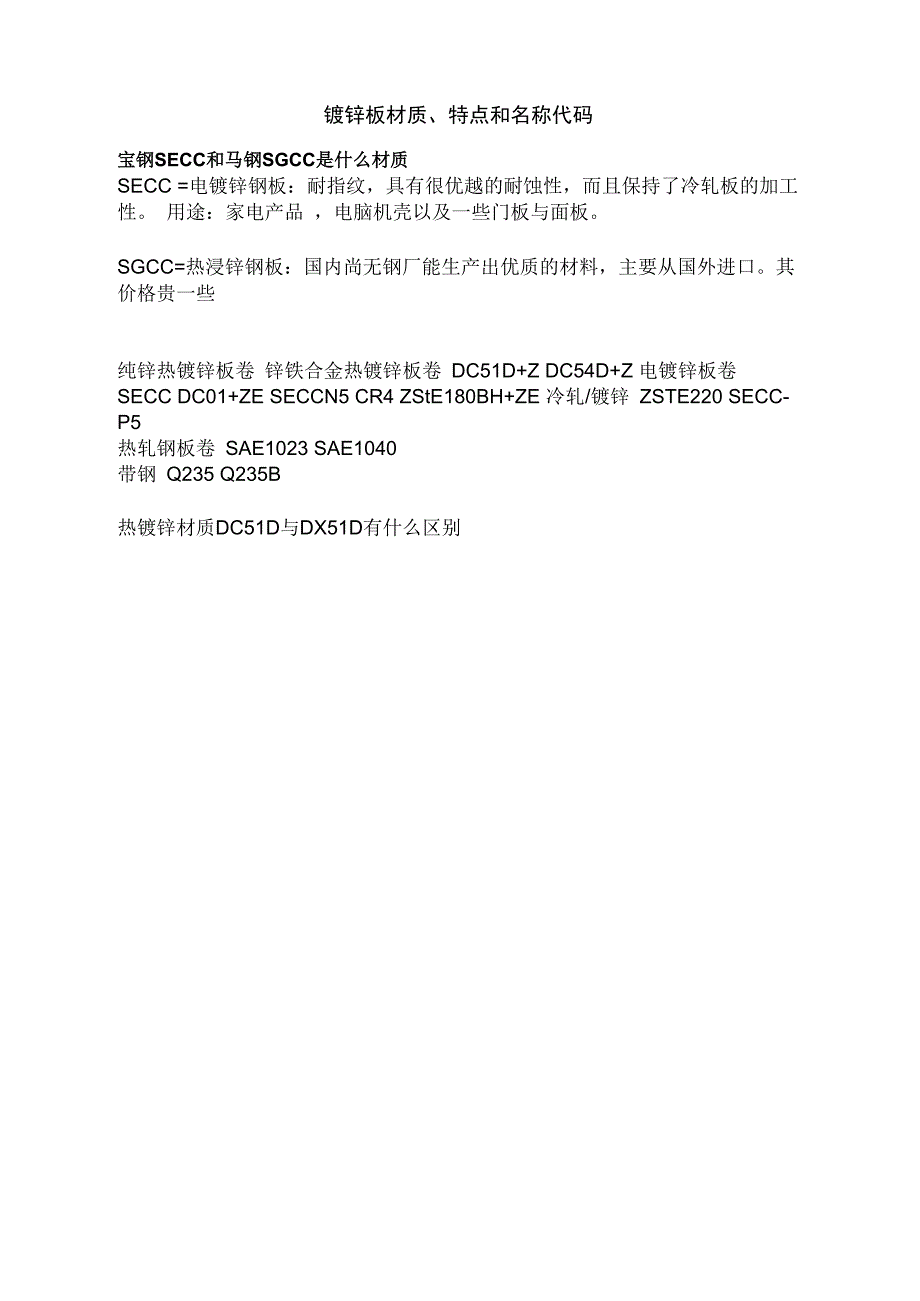 镀锌板材质、特点和名称代码宝钢SECC和马钢SGCC是什么材质SECC =电镀锌钢板:耐指纹,具有很优越的耐蚀性,而且保持了冷轧板的加工 性 用途:家电产品 ,电脑机壳以及一些门板与面板SGCC=热浸锌钢板:国内尚无钢厂能生产出优质的材料,主要从国外进口其 价格贵一些纯锌热镀锌板卷 锌铁合金热镀锌板卷 DC51D+Z DC54D+Z 电镀锌板卷 SECC DC01+ZE SECCN5 CR4 ZStE180BH+ZE 冷轧/镀锌 ZSTE220 SECC-P5热轧钢板卷 SAE1023 SAE1040带钢 Q235 Q235B热镀锌材质DC51D与DX51D有什么区别德标是 ST02Z欧标是 DX51D DIN EN 10327美标是 CS-B ASTM A 653日标是 SGCC JIS G 3302国标是 01 gb2518-2004宝钢的企业标准 BQB425-2004 DC51D其实跟 DX51D 属同一类DX51D是弯曲和成形级镀锌板、钢级序列号为51,以低碳钢作为基材钢级序列号 52-56 的为冲压用钢板或钢带DX51D的主要化学成分如下:C%S0.07、Si%S0.03、Mn%S0.50、P%<0.025> S%<0.025> Alt%>0.020此为热镀锌板类型DX51D+Z, DX51D+ZF: bending and profiling quality,DX52D+Z, DX52D+ZF: drawing quality,DX53D+Z, DX53D+ZF: deep drawing quality,DX54D+Z, DX54D+ZF: special deep drawing quality,DX56D+Z, DX56D+ZF: extra deep drawing quality.DX51D+Z275 他的中文名称就叫做热镀锌 热镀锌上面镀了一层锌 140代表镀了140 克锌/ 平方米上去 275 代表镀了275 克锌上去。