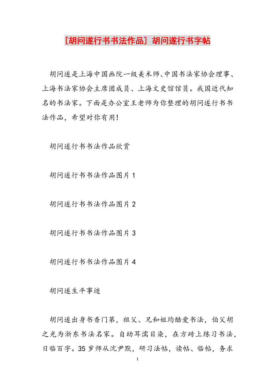 [胡问遂行书书法作品] 胡问遂行书字帖 胡问遂是上海中国画院一级美术师、中国书法家协会理事、上海书法家协会主席团成员、上海文史馆馆员我国近代知名的书法家下面是办公室王老师为你整理的胡问遂行书书法作品,希望对你有用! 胡问遂行书书法作品欣赏 胡问遂行书书法作品图片1 胡问遂行书书法作品图片2 胡问遂行书书法作品图片3 胡问遂行书书法作品图片4 胡问遂生平事迹 胡问遂出身书香门第,祖父、兄和姐均酷爱书法,伯父胡之光为浙东书法名家自幼耳濡目染,在方砖上练习书法,日临百字35岁师从沈尹默,研习法帖,读帖、临帖,务求察之者尚精,拟之者贵似,反复琢磨如何下笔、运笔、转折、交待四年间,临颜真卿告身帖逾千通,到达几可乱真地步所临书帖送师过目,竟误以为是印刷复制品 有一次,师徒一起临写郑文公,沈师比照两人临书后说:你比我临得像胡问遂听了很快乐,以为在表扬自己可仔细品味沈师临作,发现沈书神态、意趣深得原碑真髓才恍然大悟,不能以形似为满足,当贵在得古人之神韵 胡问遂早年学柳公权,继学颜鲁公,得厚重丰润之精髓,转习褚遂良,得缜密灵动之韵致。