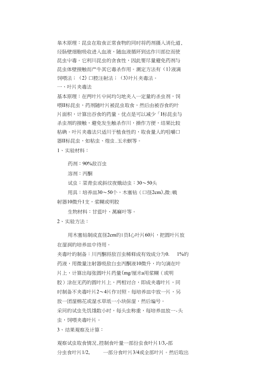 皋木原理:昆虫在取食正常食物的同时将药剂摄入消化道, 经肠壁细胞吸收进入血液,随血液循环到达作川部位而使 昆虫中毒它利川昆虫的贪食性,因此要尽量避免药剂与 昆虫体壁接触而产牛其它毒杀作用测定方法有(1)液滴 饲喂法;(2) 口腔注射法;(3)叶片夹毒法一、叶片夹毒法基本原理:在两叶片中间均匀地夹入一定量的杀虫剂,饲 喂II标昆虫,药剂随叶片被昆虫取食,然后由被吞食的叶 片面积,计算出吞食的药量优点是可以减少「I标昆虫与 杀虫剂的接触,避免发生触杀作川,操作方便,结果比较 粘确叶片夹毒法只适川于植食性的,取食量人的咀嚼口 器II标昆虫,如粘虫、煌虫.玉米螟等1、 实验材料:药剂:90%敌百虫溶剂:丙酮试虫:菜青虫或斜纹夜娥幼虫:30〜50头用具:培养皿30〜50个,木塞钻(口径2cm),微:戦射器10微升1支,浆糊或明胶生物材料:甘蓝叶、萬麻叶等2、 实验方法:用木塞钻制成直径2cm的|员I心叶片60片,把圆叶片放 在湿润的培养皿中待用夹毒叶的制备:川丙酮将敌百虫稀释成有效成分为0. 1%的 药液,用微量注射器吸敌白虫丙酮液10微升,均匀滴在叶 片上,计算出每张圆叶片药量(mg/厘米a用浆糊(或明 胶)涂在无药的圆叶片上,两相对合,即成夹毒叶片,同 时制备不夹毒叶片2〜4片作对照。