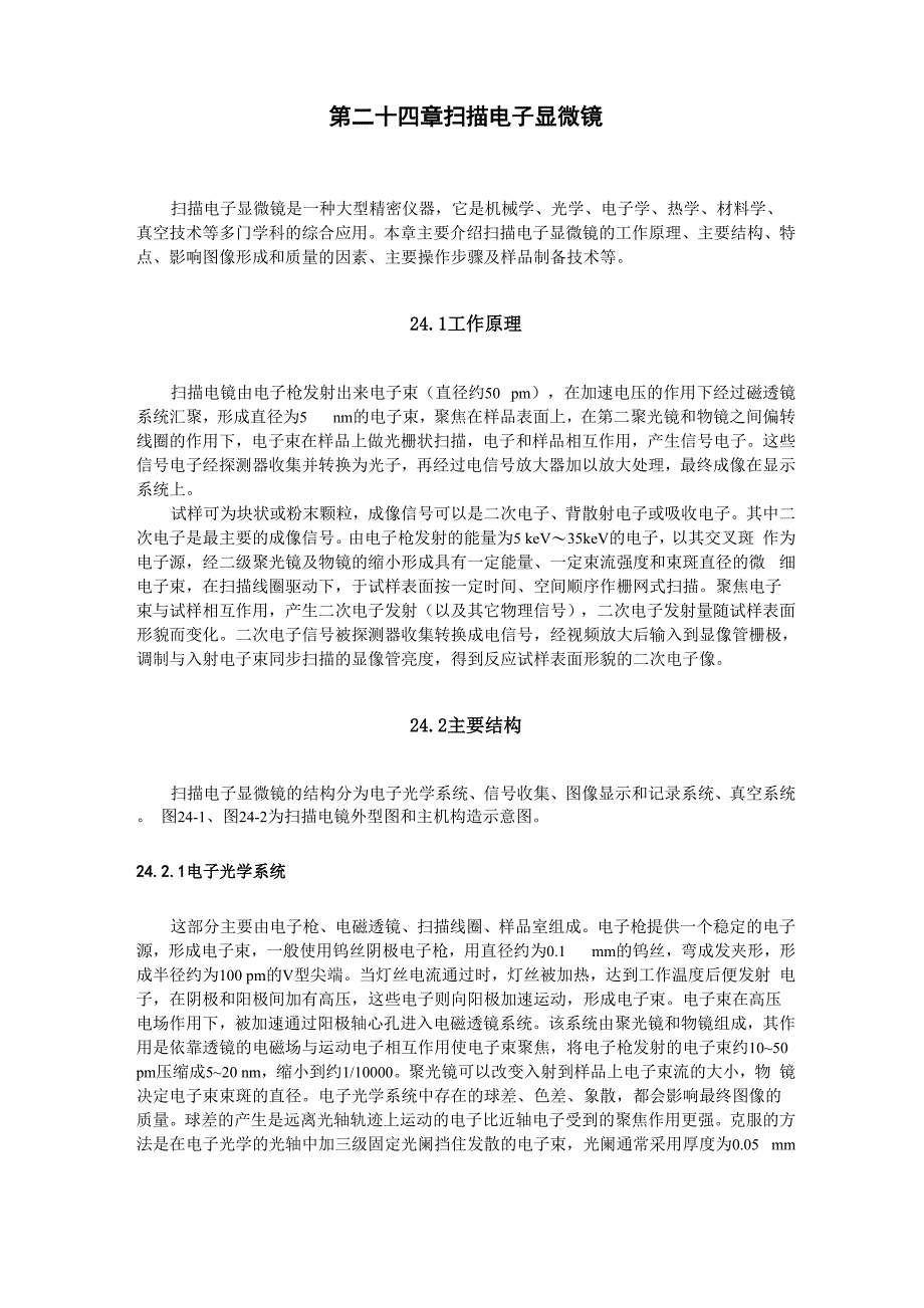 二次电子信号被探测器收集转换成电信号,经视频放大后输入到显像管栅极, 调制与入射电子束同步扫描的显像管亮度,得到反应试样表面形貌的二次电子像24.2主要结构扫描电子显微镜的结构分为电子光学系统、信号收集、图像显示和记录系统、真空系统 图24-1、图24-2为扫描电镜外型图和主机构造示意图24.2.1电子光学系统这部分主要由电子枪、电磁透镜、扫描线圈、样品室组成电子枪提供一个稳定的电子 源,形成电子束,一般使用钨丝阴极电子枪,用直径约为0.1 mm的钨丝,弯成发夹形,形 成半径约为100 pm的V型尖端当灯丝电流通过时,灯丝被加热,达到工作温度后便发射 电子,在阴极和阳极间加有高压,这些电子则向阳极加速运动,形成电子束电子束在高压 电场作用下,被加速通过阳极轴心孔进入电磁透镜系统该系统由聚光镜和物镜组成,其作 用是依靠透镜的电磁场与运动电子相互作用使电子束聚焦,将电子枪发射的电子束约10~50 pm压缩成5~20 nm,缩小到约1/10000聚光镜可以改变入射到样品上电子束流的大小,物 镜决定电子束束斑的直径电子光学系统中存在的球差、色差、象散,都会影响最终图像的 质量球差的产生是远离光轴轨迹上运动的电子比近轴电子受到的聚焦作用更强。