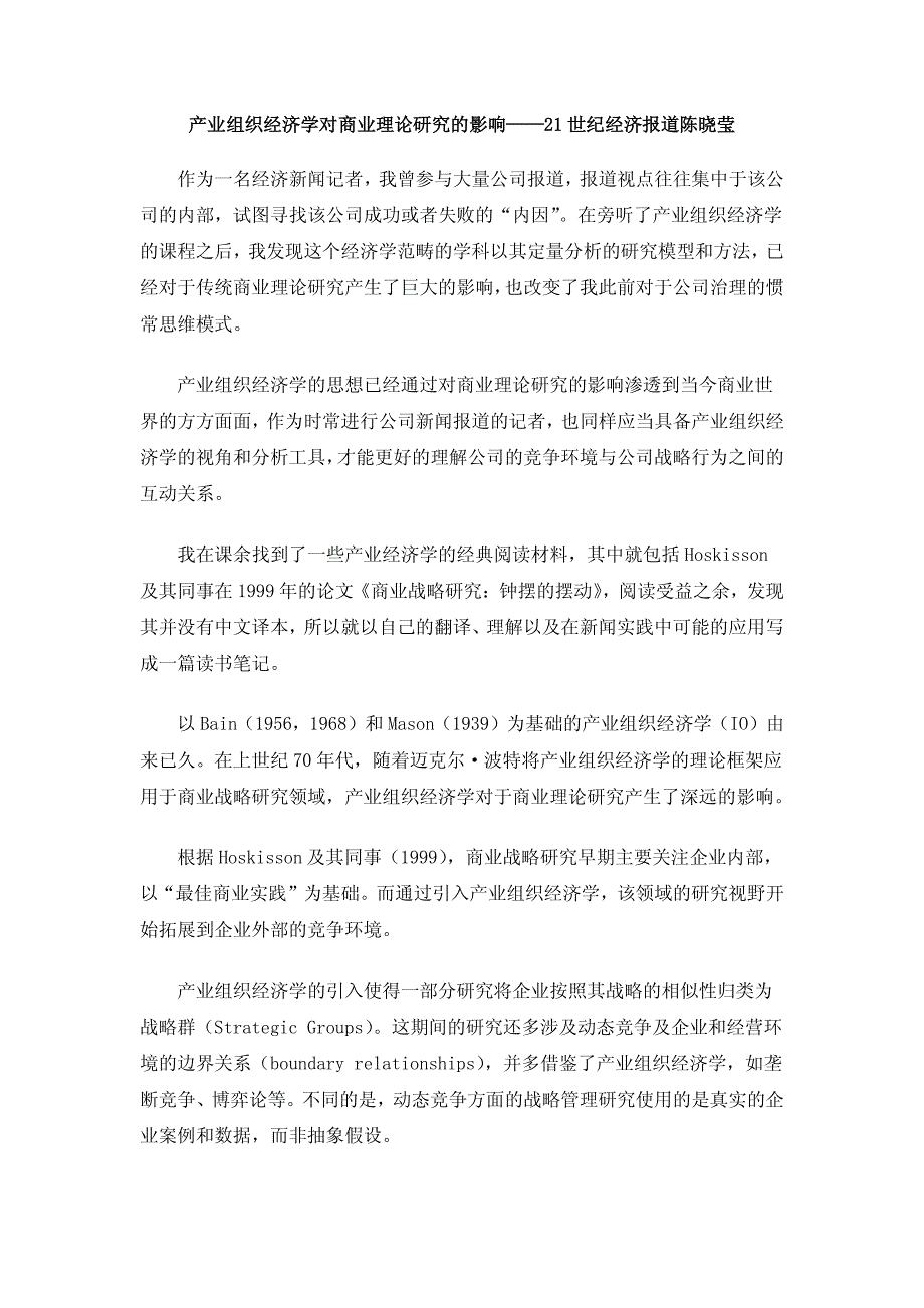 产业组织经济学对商业理论研究的影响产业组织经济学对商业理论研究的影响————2121 世纪经济报道陈晓莹世纪经济报道陈晓莹 作为一名经济新闻记者,我曾参与大量公司报道,报道视点往往集中于该公司的内部,试图寻找该公司成功或者失败的“内因” 在旁听了产业组织经济学的课程之后, 我发现这个经济学范畴的学科以其定量分析的研究模型和方法,已经对于传统商业理论研究产生了巨大的影响, 也改变了我此前对于公司治理的惯常思维模式 产业组织经济学的思想已经通过对商业理论研究的影响渗透到当今商业世界的方方面面,作为时常进行公司新闻报道的记者,也同样应当具备产业组织经济学的视角和分析工具, 才能更好的理解公司的竞争环境与公司战略行为之间的互动关系 我在课余找到了一些产业经济学的经典阅读材料,其中就包括 Hoskisson及其同事在 1999 年的论文《商业战略研究:钟摆的摆动》 ,阅读受益之余,发现其并没有中文译本,所以就以自己的翻译、理解以及在新闻实践中可能的应用写成一篇读书笔记 以 Bain(1956,1968)和 Mason(1939)为基础的产业组织经济学(IO)由来已久在上世纪 70 年代,随着迈克尔·波特将产业组织经济学的理论框架应用于商业战略研究领域,产业组织经济学对于商业理论研究产生了深远的影响。
