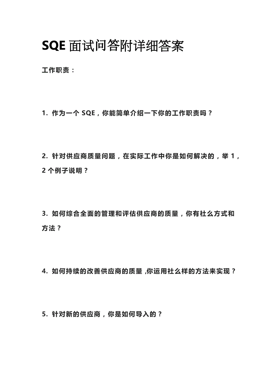 SQE面试问答附详细答案工作职责:1. 作为一个SQE,你能简单介绍一下你的工作职责吗?2. 针对供应商质量问题,在实际工作中你是如何解决的,举1,2个例子说明?3. 如何综合全面的管理和评估供应商的质量,你有社么方式和方法?4. 如何持续的改善供应商的质量,你运用社么样的方法来实现?5. 针对新的供应商,你是如何导入的?简单的质量知识:1. 你了解FMEA吗,说明O,S,D, RPN是何解释,举例说明FMEA?2. SPC, 有那些控制工具,各使用在何场合,CP,CPK;CPK, PPK的区别?3. 简单说明ISO9000/TS16949的八大原则?4. 举一个例子说明如何完成GR&R?5. 你对6Sigma有多少了解,概述一下6sigma,举例说明假设检验和DOE.当然还有一些专业性的问题,基本都是关于产品的问题点,Root cause, 如何改善,比如说注塑成形会产生社么问题,原因是设么,如何改善等等另外,如果你是去欧美企业,上面的问题可能都会是英文提问,然后英文回答, 呵呵问答题:1. 作为一个SQE,你能简单介绍一下你的工作职责吗?简单点,就是要公司花钱买到好的产品和服务,以保证本公司的产品质量.SQE就是要监督和供应商达到公司产品质量要求甚至超越公司要求.2. 针对供应商质量问题,在实际工作中你是如何解决的,举1,2个例子说明?若公司出现质量问题,是供应商来料问题,首先要看是新供应商还是一直配合的供应商,新供应商就要有针对性了,第一要告诉他们我们公司要求,及测试要求等,还要去现场进行和培训.旧的供应商要写改善报告,在去现场验证.不是很严重可以根据下批来料进行验证.举例就不说了.3. 如何综合全面的管理和评估供应商的质量,你有社么方式和方法?首先要看是什么产品,针对产品(电子产品)进行分类是五金产品\包材\PCB还是其它,举例:五金产品从新供应商导入到正式订单,IQC对来料进行评估(包括产品质量\交期等),以数据进行分析.4. 如何持续的改善供应商的质量,你运用社么样的方法来实现?采用软硬兼施的办法,一方面要让供应商感觉和你是很好的朋友,愿意帮助他们,同时要那么去改善产品质量.一方面要对有质量问题的供应商进行惩罚,但是要注意不要过头.5. 针对新的供应商,你是如何导入的?答1.制作审核清单和审核计划.2.查看工程承认样品是否合格.3.通知审核日期.4.现场审核.5.审核结果.简单的叙述了一下.具体细节要靠自己去领悟.简单知识就不说了.答2.本人对SQE的理解为供应商质量管理。