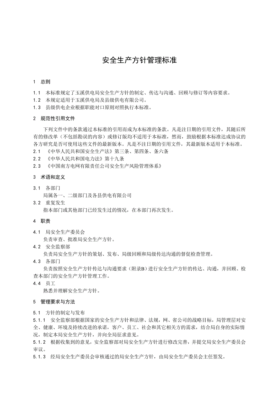 安全生产方针管理标准1 总则1.1 本标准规定了玉溪供电局安全生产方针的制定、传达与沟通、回顾与修订等内容要求1.2 本规定适用于玉溪供电局及县级供电有限公司1.3 县级供电企业根据职能对口原则对照执行本标准2 规范性引用文件下列文件中的条款通过本标准的引用而成为本标准的条款凡是注日期的引用文件,其随后所有的修改单(不包括勘误的内容)或修订版均不适用于本标准,然而,鼓励根据本标准达成协议的各方研究是否可使用这些文件的最新版本凡是不注日期的引用文件,其最新版本适用于本标准2.1 《中华人民共和国安全生产法》第三条、第四条、条六条2.2 《中华人民共和国电力法》第十九条2.3 《中国南方电网有限责任公司安全生产风险管理体系》3 术语和定义3.1 各部门局属各一、二级部门及各县供电有限公司3.2 重复发生指本部门或其他部门已经发生过的情况,在本部门再次发生4 职责4.1 局安全生产委员会负责审查、批准局安全生产方针4.2 安全监察部负责局安全生产方针的策划、发布、局级回顾和局级传达沟通的督促检查管理4.3 各部门负责按照安全生产方针传达与沟通要求(附录B)进行安全生产方针的传达、沟通,并回顾、检查本部门的安全生产方针管理工作。