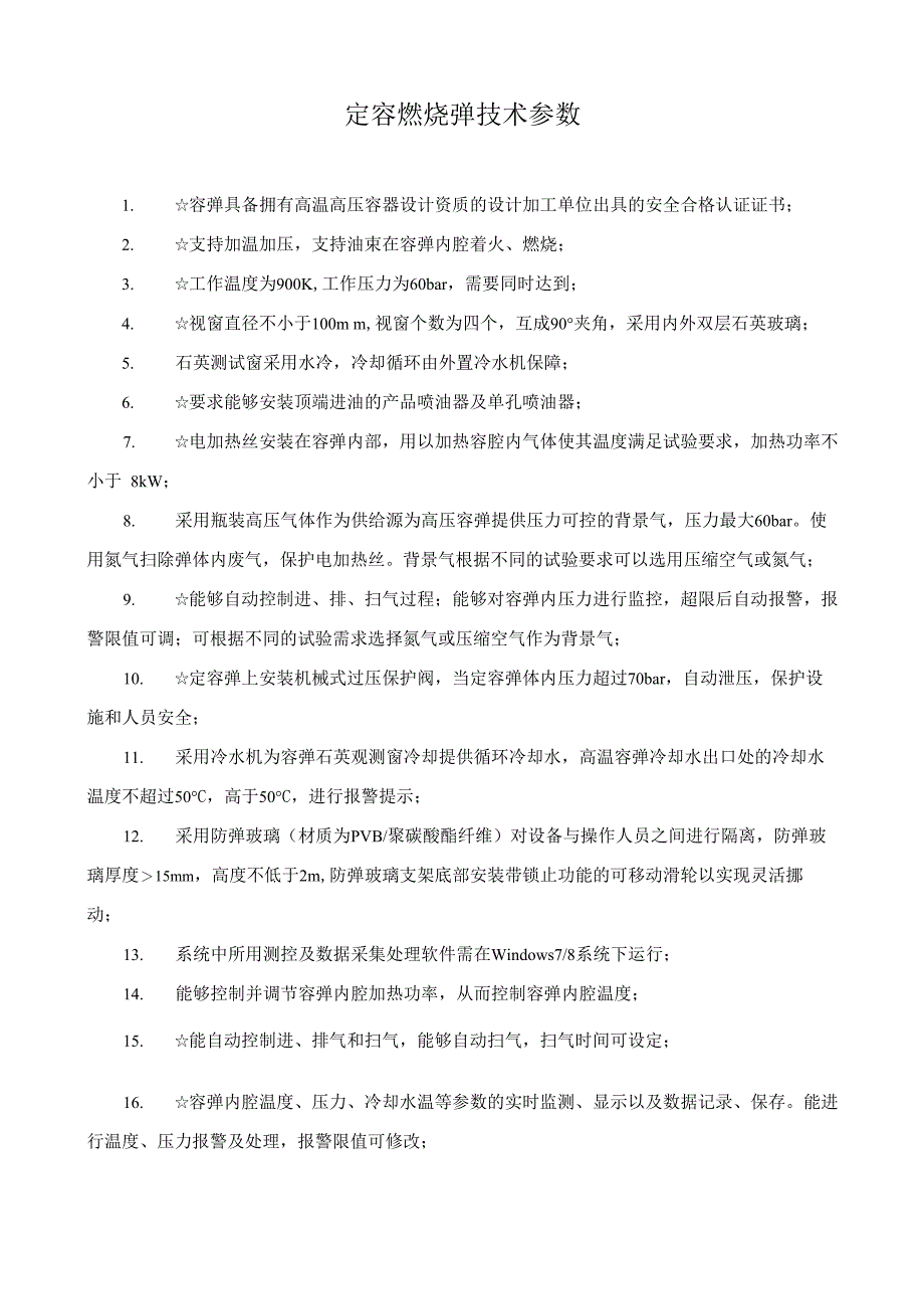 定容燃烧弹技术参数1. ☆容弹具备拥有高温高压容器设计资质的设计加工单位出具的安全合格认证证书;2. ☆支持加温加压,支持油束在容弹内腔着火、燃烧;3. ☆工作温度为900K,工作压力为60bar,需要同时达到;4. ☆视窗直径不小于100m m,视窗个数为四个,互成90°夹角,采用内外双层石英玻璃;5. 石英测试窗采用水冷,冷却循环由外置冷水机保障;6. ☆要求能够安装顶端进油的产品喷油器及单孔喷油器;7. ☆电加热丝安装在容弹内部,用以加热容腔内气体使其温度满足试验要求,加热功率不 小于 8kW;8. 采用瓶装高压气体作为供给源为高压容弹提供压力可控的背景气,压力最大60bar使 用氮气扫除弹体内废气,保护电加热丝背景气根据不同的试验要求可以选用压缩空气或氮气;9. ☆能够自动控制进、排、扫气过程;能够对容弹内压力进行监控,超限后自动报警,报 警限值可调;可根据不同的试验需求选择氮气或压缩空气作为背景气;10. ☆定容弹上安装机械式过压保护阀,当定容弹体内压力超过70bar,自动泄压,保护设 施和人员安全;11. 采用冷水机为容弹石英观测窗冷却提供循环冷却水,高温容弹冷却水出口处的冷却水 温度不超过50°C,高于50°C,进行报警提示;12. 采用防弹玻璃(材质为PVB/聚碳酸酯纤维)对设备与操作人员之间进行隔离,防弹玻 璃厚度>15mm,高度不低于2m,防弹玻璃支架底部安装带锁止功能的可移动滑轮以实现灵活挪 动;13. 系统中所用测控及数据采集处理软件需在Windows7/8系统下运行;14. 能够控制并调节容弹内腔加热功率,从而控制容弹内腔温度;15. ☆能自动控制进、排气和扫气,能够自动扫气,扫气时间可设定;16. ☆容弹内腔温度、压力、冷却水温等参数的实时监测、显示以及数据记录、保存。