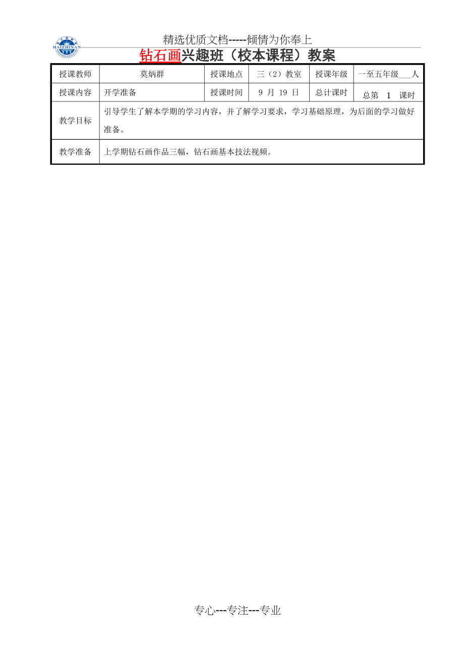精选优质文档-----倾情为你奉上钻石画兴趣班(校本课程)教案授课教师莫炳群授课地点三(2)教室授课年级一至五年级___人授课内容开学准备授课时间9 月 19 日总计课时总第 1 课时教学目标引导学生了解本学期的学习内容,并了解学习要求,学习基础原理,为后面的学习做好准备 教学准备上学期钻石画作品三幅,钻石画基本技法视频教学过程一、引入课题愉快的假期结束了,我们又迎来了新的一学期,很高兴我们又见面了本学期里,学校实施兴趣班转型,按照全员参与的原则,组织开展兴趣班活动感谢大家选报“钻石画”,本学期,我们将一起走进兴趣班活动中,去寻找钻石画的快乐板书课题 :钻石画,也叫钻石绣) 二、明确目标本学期我们将围绕钻石画进行学习,了解“钻石画”的艺术特色,学习钻石画的基本技法,学习创造钻石画三、制作形式 以个人为单位,在老师的指导下,完成钻石画创造同时,发挥小组作用,在小组带领下,相互帮助,团结合作 四、考勤点名点名安排位置,以4人为一小组,指定小组长五、强调纪律1.原则上凡是报名参加钻石画兴趣班的学生,一学期内中途不得转班2.开学初兴趣班所有学生应及时购买钻石画所需材料和工具,以保证正常上课。
