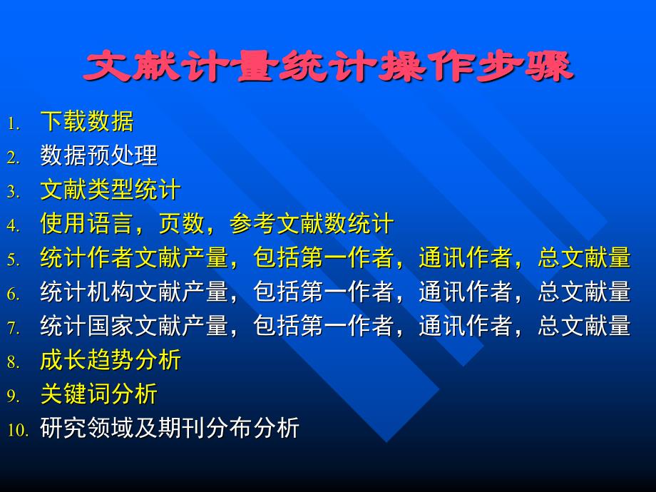 文献计量统计操作步骤文献计量统计操作步骤1. 1.下载数据下载数据2. 2.数据预处理数据预处理3. 3.文献类型统计文献类型统计4. 4.使用语言,页数,参考文献数统计使用语言,页数,参考文献数统计5. 5.统计作者文献产量,包括第一作者,通讯作者,总文献量统计作者文献产量,包括第一作者,通讯作者,总文献量6. 6.统计机构文献产量,包括第一作者,通讯作者,总文献量统计机构文献产量,包括第一作者,通讯作者,总文献量7. 7.统计国家文献产量,包括第一作者,通讯作者,总文献量统计国家文献产量,包括第一作者,通讯作者,总文献量8. 8.成长趋势分析成长趋势分析9. 9.关键词分析关键词分析10.10.研究领域及期刊分布分析研究领域及期刊分布分析 第一步:下载数据第一步:下载数据进入进入进入进入::::武汉大学图书馆武汉大学图书馆→→数据库数据库→→SCIESCIE       ((Science Citation Index 1999-Science Citation Index 1999-)) 在WOS Search里,搜索TOPIC:  Enter one or more terms. Searches within article titles, keywords, and abstracts.Example: drink* AND water* ; drink* OR water* ; ‘drink* water*’ 不同单词之间可用and或or来连接;*在这里表示后续内容可为任意。
