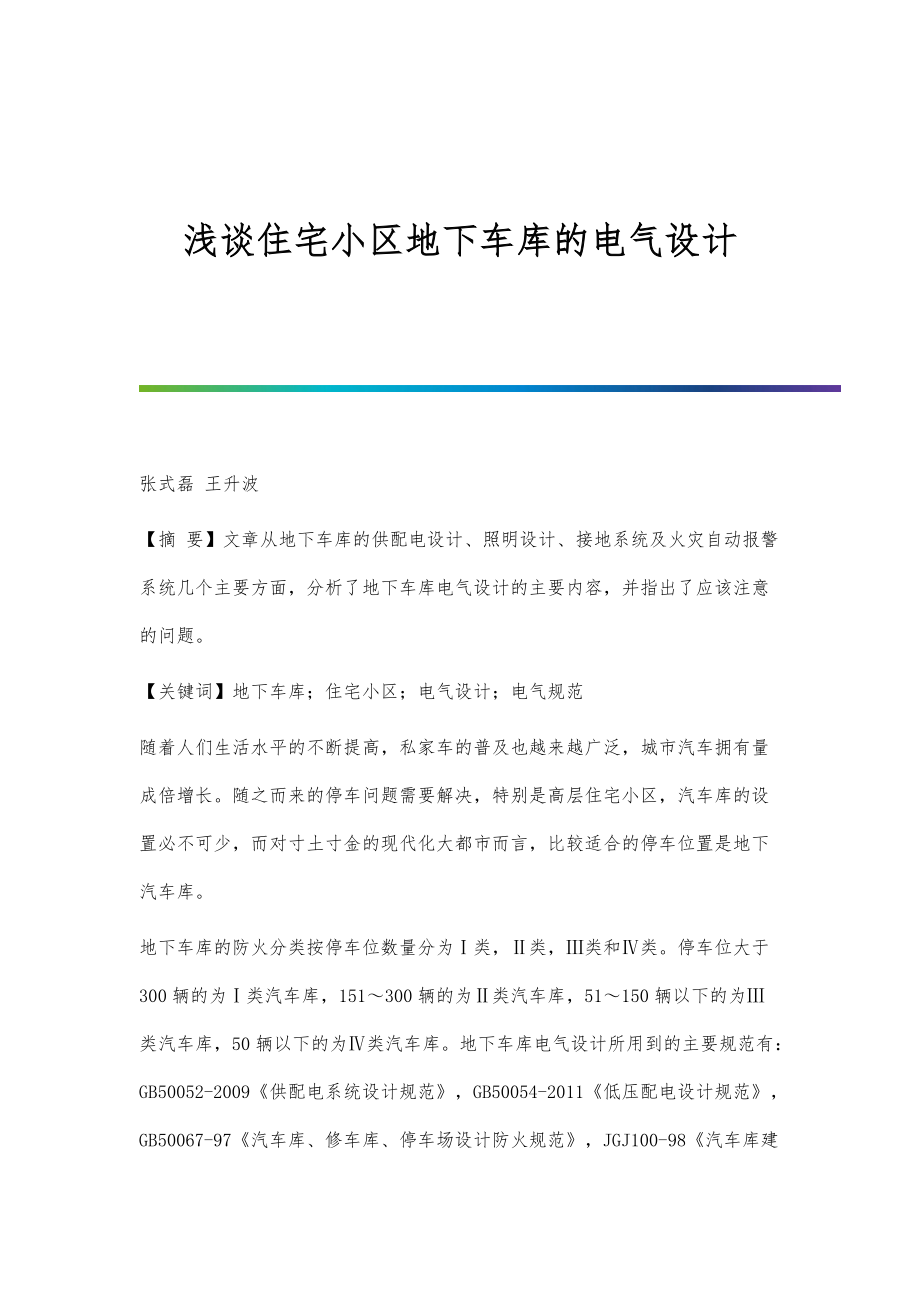浅谈住宅小区地下车库的电气设计 张式磊 王升波【摘 要】文章从地下车库的供配电设计、照明设计、接地系统及火灾自动报警系统几个主要方面,分析了地下车库电气设计的主要内容,并指出了应该注意的问题关键词】地下车库;住宅小区;电气设计;电气规范随着人们生活水平的不断提高,私家车的普及也越来越广泛,城市汽车拥有量成倍增长随之而来的停车问题需要解决,特别是高层住宅小区,汽车库的设置必不可少,而对寸土寸金的现代化大都市而言,比较适合的停车位置是地下汽车库地下车库的防火分类按停车位数量分为Ⅰ类,Ⅱ类,Ⅲ类和Ⅳ类停车位大于300辆的为Ⅰ类汽车库,151~300辆的为Ⅱ类汽车库,51~150辆以下的为Ⅲ类汽车库,50辆以下的为Ⅳ类汽车库地下车库电气设计所用到的主要规范有:GB50052-2009《供配电系统设计规范》,GB50054-2011《低压配电设计规范》,GB50067-97《汽车库、修车库、停车场设计防火规范》,JGJ100-98《汽车库建筑设计规范》,GB50016-2006《建筑设计防火规范》,JGJ16-2008《民用建筑电气设计规范》,GB50034-2004《建筑照明设计标准》下面从几个方面,谈一下地下车库的电气设计:1.供配电设计供电负荷等级要求:依据JGJ 100-98《汽车库、修车库、停车场设计防火规范》,消防水泵、火灾自动报警、自动灭火、排烟风机、补风机、电动防火卷帘、火灾应急照明等消防用电,Ⅰ类汽车库应按一级负荷供电,Ⅱ、Ⅲ类汽车库应按二级负荷供电。