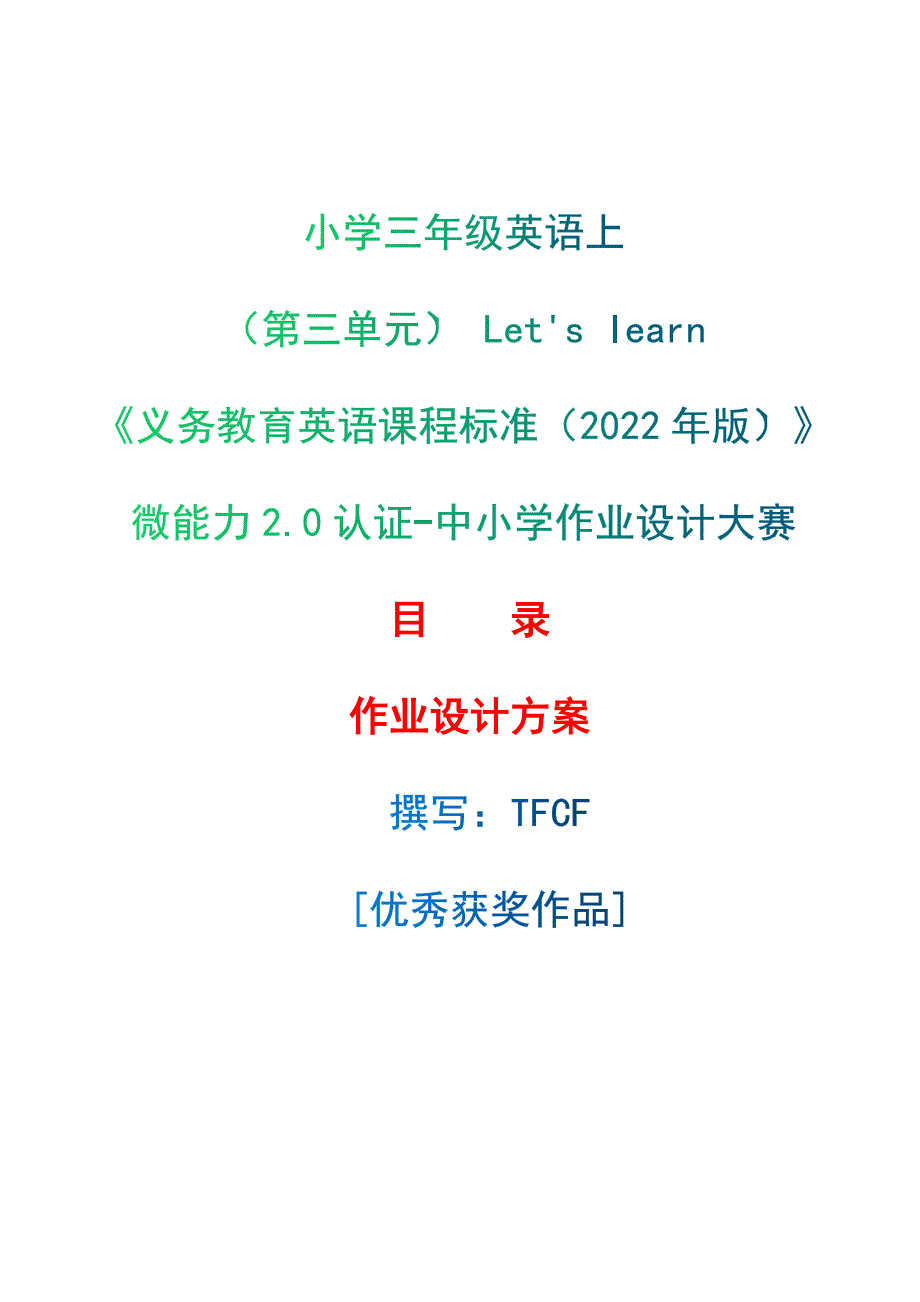 小学三年级英语上(第三单元) Let's learn《义务教育英语课程标准(2022年版)》微能力2.0认证-中小学作业设计大赛目 录作业设计方案撰写:TFCF[优秀获奖作品]3一、单元信息基本信息学科年级学期教材版本单元名称英语三年级第一学期PEP 人教版Unit 3 Look at me单元 组织方式团 自然单元 重组单元课时信息序 号课时名称对应教材内容1第一课时Part A Let's talk & let's play (P24)2第二课时Part A Let's learn & let's do (P25)3第三课时Part A Letters and sounds (P26)4第四课时Part B Let's talk & let's play (P27)5第五课时Part B Let's learn & let's do (P28)6第六课时Part C Story time (P31)第 1 页二、单元分析PEP 人教版 三年级英语上册(一) 课标要求根据小学英语课程标准, 三年级学生要达到以下教学目标: 对英语有好奇心, 喜欢听他人说英语。