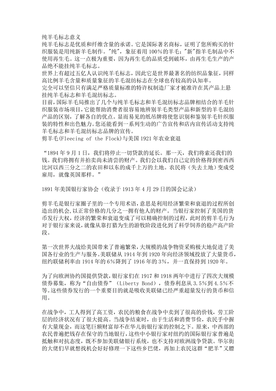 纯羊毛标志意义 纯羊毛标志是优质和纤维含量的承诺它是国际著名商标,证明了您所购买的针织服装是用纯新羊毛制作"纯",象征着用100%的羊毛;"新"指羊毛制品中不使用再生毛这一点极为重要,因为再生毛的品质受到破坏,由再生毛生产的产品绝不能挂纯羊毛标志 世界上有超过五亿人认识纯羊毛标志,因此它是世界最著名的纺织品象征,同样高比例羊毛含量和质量象征的羊毛混纺标志在全球也有较高的认知率 完全可以坚信只有满足严格质量标准的特许权制造厂家才被准许在其产品上悬挂纯羊毛标志和羊毛混纺标志 目前,国际羊毛局推出了几个与纯羊毛标志和羊毛混纺标志品牌相结合的羊毛针织服装市场项目,它能帮助消费者很容易地辨别羊毛类型产品和新型的羊毛混纺产品的区别,了解各自的优点显而易见的纸吊牌将使您识别和鉴别羊毛针织服装的特性和出色魅力您还能看到一系列生动的广告宣传和店内宣传活动支持纯羊毛标志和羊毛混纺标志品牌的宣传剪羊毛(Fleecing of the Flock)与美国1921年农业衰退 “1894年9月1日,我们将停止一切贷款的延长那一天,我们将索还我们的钱我们将拥有并拍卖尚未清尝的财产我们会以我们自己定的价格得到密西西比河以西三分之二的农田和以东的成千上万的土地。