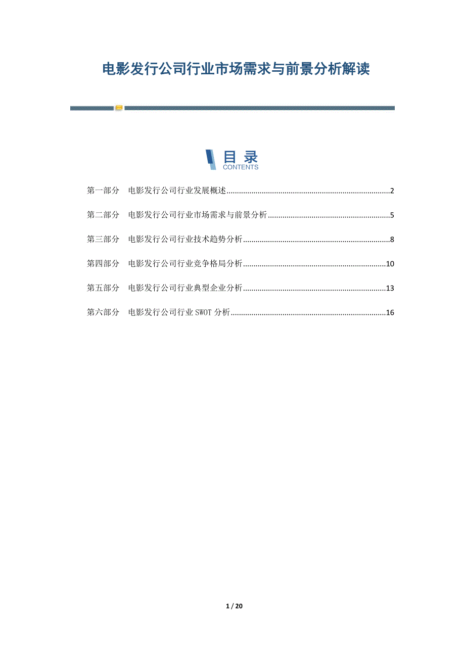 电影发行公司行业市场需求与前景分析解读 第一部分 电影发行公司行业发展概述 2第二部分 电影发行公司行业市场需求与前景分析 5第三部分 电影发行公司行业技术趋势分析 8第四部分 电影发行公司行业竞争格局分析 10第五部分 电影发行公司行业典型企业分析 13第六部分 电影发行公司行业SWOT分析 16第一部分 电影发行公司行业发展概述电影发行公司是电影行业中不可或缺的一环,它负责将电影作品引入市场、展示给观众,促进电影行业的发展随着电影产业的不断发展,电影发行公司在过去几十年中经历了显著的变化和创新本文将对电影发行公司行业的发展进行概述一、行业背景和概况电影发行公司是电影产业链中的重要环节,其主要职责包括选择、购买、发行和推广电影作品电影发行公司通过与制片方签订合同,取得电影的发行权,然后将电影安排在不同的发行渠道上,如电影院、电视、网络等,使之最终触达观众二、发展历程1. 早期阶段:在电影行业刚刚起步时,电影发行主要由个别公司承担,他们主要依靠独立的影院网络进行电影的发行,观众数量有限在这个阶段,电影发行公司的规模相对较小,市场份额分散2. 垄断时期:进入上世纪50年代至80年代,全球电影市场逐渐形成了垄断格局,少数几家大型电影发行公司垄断了市场份额。