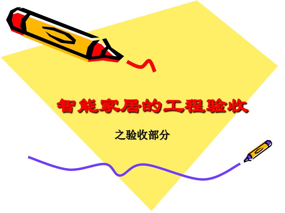 智能家居的工程验收智能家居的工程验收智能家居的工程验收智能家居的工程验收之验收部分之验收部分之验收部分之验收部分验收验收内容介绍内容介绍±建筑电气验收的标准±验收的主要项目±验收方法±智能家居验收的标准±产品验收±系统功能的验收 验收建筑电气验收的标准建筑电气验收的标准《建筑电气工程施工质量验收规范》 GB 50303-2002 《智能建筑工程质量验收规范 》 GB 50339-2003 《民用建筑电气设计规范》 JGJ 16-2008 《电气装置安装工程接地装置施工及验收规范》 GB 50169-2006《电气装置安装工程电气设备交接试验标准》 GB 50150-2006 《综合布线系统工程设计规范》 GB 50311-2007《综合布线系统工程验收规范》 GB 50312-2007 《建筑照明设计设计标准 》 GB 50034-2004 验收1、建筑电气工程施工现场的质量管理,除应符合现行国家标准《建筑工程施工 质量验收统一标准》GB 50300—2001 的 3.0.1 规定外,尚应符合下列规定: 1)安装电工、焊工、起重吊装工和电气调试人员等,按有关要求持证上岗; 2)安装和调试用各类计量器具,应检定合格,使用时在有效期内。